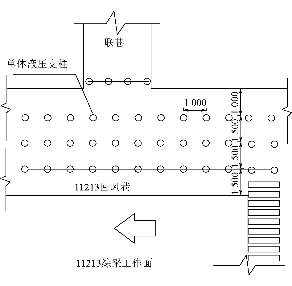 图7 11213回风巷支护断面布置 (1)巷道顶板采用高预紧力桁架锚索支护技术。锚索采用Φ17.8 mm×6 000 mm高强度低松弛钢绞线,排距以1 800 mm和2 700 mm交替布置,每2.5 m布置1组,每组2根,钻孔倾斜角度与顶板垂线的夹角15°,锚索锚固力不小于200 kN,预紧力不小于180 kN。 (2)煤柱帮采用锚杆+锚索+钢带联合支护。距巷道顶板500、1 500 mm处补打锚索,距顶板2 800 mm处补打锚杆,排距均为1 500 mm,其中锚索采用Φ17.8 mm×6 000 mm高强度低松弛钢绞线,锚杆采用Φ16 mm×1 800 mm圆钢锚杆,采用BHW-280-3.00型、长度为2.8 m的钢带,每根钢带上施工2根锚索+1根锚杆。 (3)回采帮补打3根Φ22 mm×2 400 mm全螺纹玻璃钢复合材料锚杆,矿用阻燃塑料网片联合支护。玻璃钢锚杆间排距为1 000 mm×1 500 mm。 3.3 特殊地段补强加固3.3.1 端头支护 端头区控制现多采用端头液压支架与单体液压支柱超前支护联合支护方式。考虑到11213工作面端头应力集中程度较高,可适当提高端尾支架的初撑力,同时根据现场实际及时调整支架支护强度;延长回风巷单体液压支柱超前支护距离,由30 m延伸至80 m,并用安全带连接相邻单体支柱手把防止支柱倾倒。单体液压支柱超前支护如图8所示。 3.3.2 倒车硐或联巷 在过倒车硐硐口或联巷口期间在联巷口增加单体支护,增加单体支护的每个联巷口不得小于4根,以保证支护质量,如图8所示。联巷口的单体支护不得提前回撤,只有端头支架的底座与单体对齐后方才可回撤。