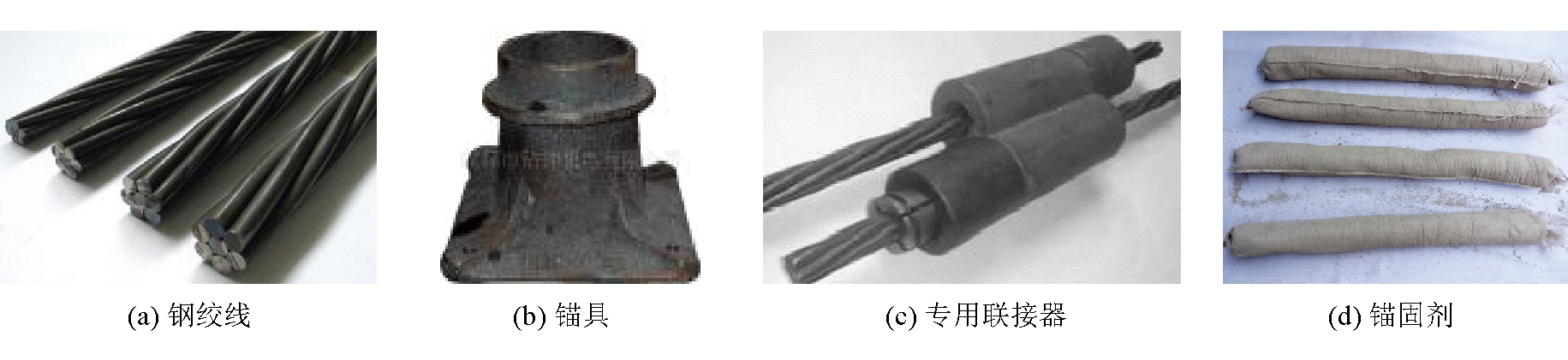 卸压方法优点缺点钻孔卸压施工量小、方便;施工速度较快;卸压效果好,灵活可靠,压力愈高,卸压效果愈好;可用于薄煤层;卸压后应力恢复较爆破卸压慢卸压效果慢,实施解危时,对施工人员的人身安全存在威胁钻孔松动爆破卸压煤体迅速产生大量裂隙,卸压效果快;应用于迅速、临时卸压爆破卸压应用范围有限;容易诱发冲击;存在安全隐患,易造成残炮、瞎炮;卸压后压力恢复较快 2.2.2 高预紧力桁架锚索支护技术 高预紧力桁架锚索支护[10-13]是以巷道覆岩两肩窝深部岩体为锚索锚固点,采用专用张拉机具通过专用连接器将倾斜的高强度预应力钢绞线锁紧,使之对巷道顶板同时产生垂直和水平两方向上的挤压应力,实现对顶板浅部围岩的兜护和对上覆岩层整体性的加固。该支护主要由高强度钢绞线、锁具、专用联接器和锚固剂等组成,实物如图4所示。
