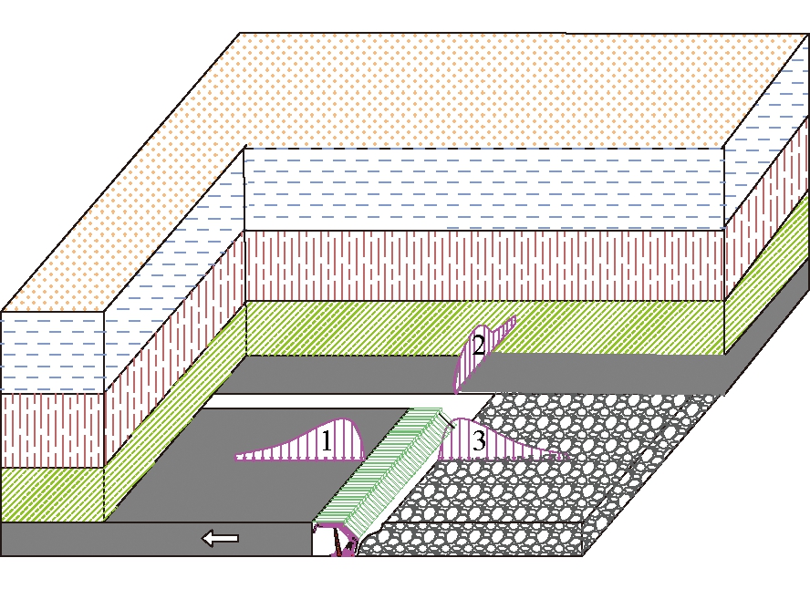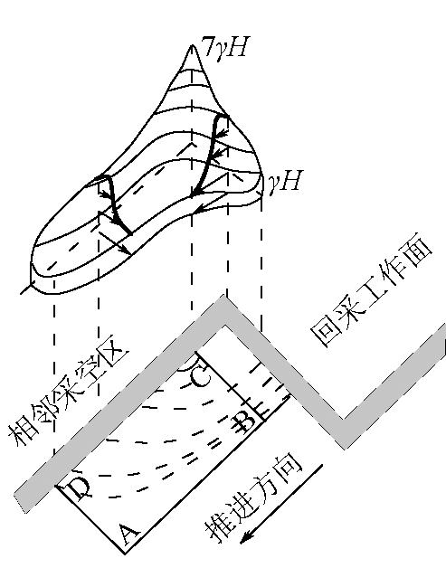图1 11213综采工作面布置 矿井工作面原接替顺序为11213综采工作面回采结束后再回采相邻11215工作面。11213工作面原设计推进长度为3 625 m,采区平均煤层厚度4.70 m,工作面采用ZY12000/28/58型液压支架。在11213工作面推进到距终采线1 085 m处时,煤层平均厚度变为3.31 m,而ZY12000/28/58型液压支架三机配套回采合理高度最低是3.60 m,不能达到回采要求。小纪汗煤矿研究决定停止11213工作面,转采11215工作面。目前,11215工作面已加采完毕,需对11213工作面剩余段进行回采。由于两个工作面相邻,且11215工作面采空区稳定时间短(3个月),11213工作面回风巷同时承受11215工作面采空区残余侧向支承压力和11213工作面超前支承压力的双重作用,处于邻空动压状态,巷道因受压过大而变形严重。因此,如何有效控制邻空动压巷道围岩的稳定性已成为安全回采11213工作面剩余段亟需解决的技术难题。 11213工作面位于2号煤层11盘区,东邻11211工作面,西邻11215工作面,南邻5条大巷。工作面长279.5 m,剩余段推进长度1 085 m。11213工作面所采2号煤层属复杂结构煤层,煤层倾角0°~1.0 °,平均倾角0.7 °,工作面剩余段煤层厚度2.78~4.00 m,煤层平均厚度3.31 m,煤层基本顶为中-细粒长石砂岩,厚度7.66~18.67 m,灰色、块状、水平层理;直接顶为粉砂质泥岩,厚度0~5.00 m,灰色、中厚层、泥质胶结、水平层理;直接底为粉砂质泥岩,厚度0.18~4.21 m,灰色、遇水易软化、波状层理。 2 邻空动压巷道治理机理2.1 采动矿压分布规律2.1.1 采动引起的周围支承压力 煤层开采打破了采场原岩应力场的原始平衡状态,使得采场周围应力重新分布。在综采工作面前方形成随工作面推进向前推移的超前支承压力区,工作面侧向形成应力数值基本不变的侧向固定支承压力区;工作面推过一定距离后,采空区上覆岩层活动将趋于稳定,在工作面后方形成数值较小的采空区残余支承压力区。其中侧向固定支承压力影响范围15~30 m,超前支承压力峰值位置距煤壁5~10 m,相当于2.0~3.5倍的回采高度[1]。工作面周围支承应力分布如图2所示。