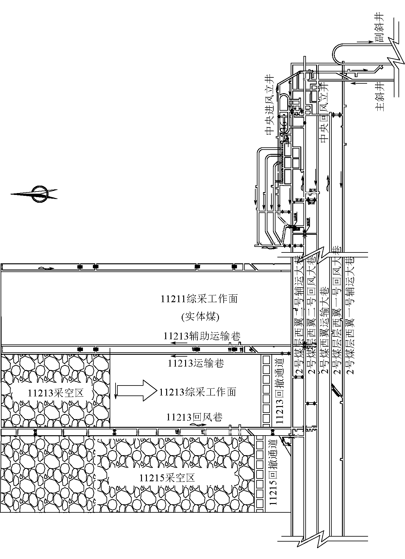 Study on surrounding rock stability control technology for gob-side dynamic pressure mining roadway随着煤矿机械化开采技术的快速发展,工作面回采速度也随之加快,在矿井工作面接替紧张的情况下,便出现了上一工作面采动影响尚未完全稳定即刻回采相邻工作面,回采巷道将受上一工作面采空区高残余支承压力和本工作面超前支承压力的双重叠加作用[1-3],即呈现邻空动压状态,从而引起巷道顶板变形剧烈、煤柱炸帮和严重底鼓等异常动压显现,甚至诱发冲击矿压、顶板垮落等灾害事故。以小纪汗煤矿11213工作面剩余段回收为工程背景,在分析邻空综采工作面回采期间矿压分布特征及借鉴相似矿井动压巷道[4-5]治理措施的基础上,阐述了支承压力叠加区概念及动压巷道“卸-支”围岩控制体系,并依据工程地质条件设计了具体防控支护方案。 1 工程概况小纪汗煤矿位于榆林市榆阳区,矿井采用斜井开拓、盘区条带式开采。目前已装备2套综采工作面、3套连续采煤机掘进工作面,其中,11213综采工作面布置如图1所示。