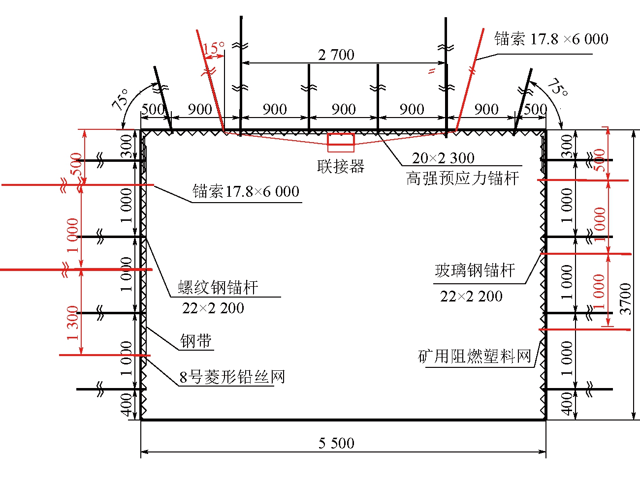 图6 卸压钻孔布置 11213综采工作面剩余段回风巷为原11213综采工作面运输巷,巷道断面为5.5 m×3.7 m(宽×高)的矩形断面。11213回风巷支护布置如图7所示,图中红色为补强支护。