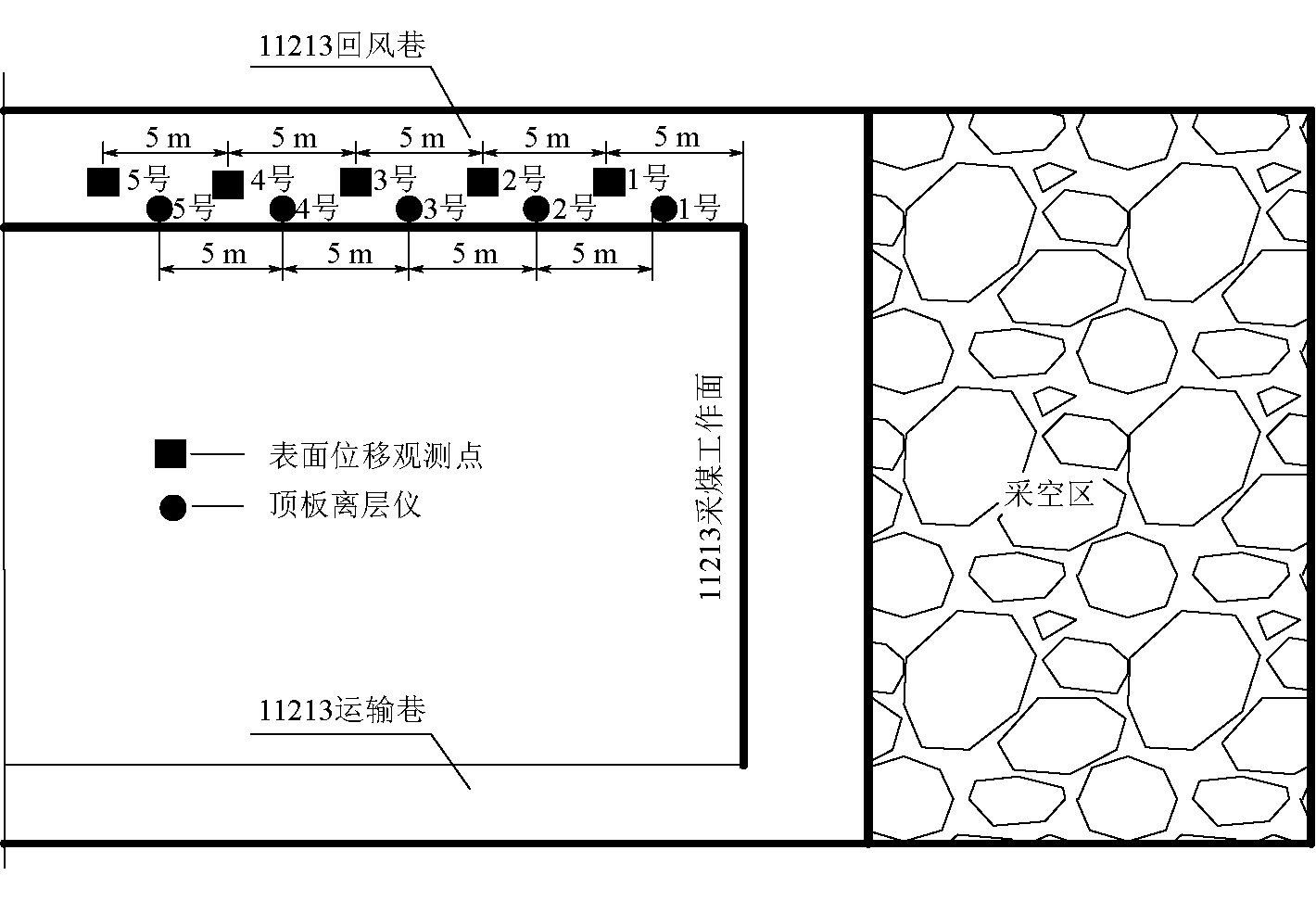 图9 水仓锚吊梁支护 4 围岩变形监测分析在11213回风巷距工作面5、10、15、20、25 m 处安设了5个“十字布桩”观测巷道表面位移变形情况,在距工作面3、8、13、18、23 m处安设了5个深度3 m顶板离层监测仪观测巷道顶板离层现象,观测点布置如图10所示。回采期间巷道顶底板移近量、两帮移近量的实测数据如图11所示,由图11可知,巷道顶底板移近量及两帮移近量在距工作面5 m处,分别为226、248 mm。距工作面距离越远,巷道顶底板移近量及两帮移近量越小,当距工作面的距离超过30 m后,顶底板移近量趋于46 mm,两帮移近量趋于62 mm。实测结果表明,在工作面回采期间采用钻孔卸压技术配合高预紧力桁架锚索支护将巷道围岩变形控制在允许范围内,保证了巷道的正常使用。