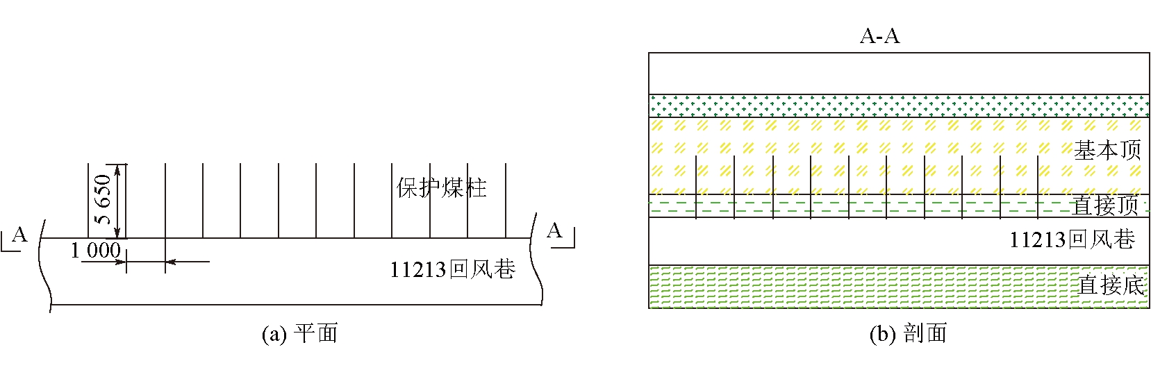 图5 桁架锚索支护顶板岩体受力状态 3 邻空动压巷道稳定性控制措施3.1 钻孔卸压技术基于钻孔卸压和钻孔松动爆破卸压的优缺点,采用钻孔卸压技术预先处理11213工作面的支承压力叠加区。通过统计分析、数值模拟和理论计算等方法确定了11213回风巷采用钻孔直径100 mm、钻孔间距1 000 mm和钻孔深度8 m的卸压方案。钻孔布置如图6所示。