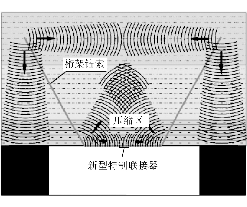 图4 桁架锚索支护组成部分实物 与垂直布置的单个锚索形成的“圆锥型”受力结构(对周围岩体只产生垂直应力作用)相比,桁架锚索支护在巷道截面上形成“凹槽型”支护结构,对顶板产生三向压力,使围岩更为稳定。桁架锚索支护顶板岩体受力状态如图5所示。
