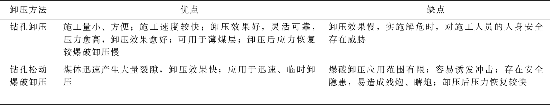 图3 支承压力叠加区示意 2.2 “卸-支”围岩控制体系据统计,动压巷道占煤矿巷道80%以上,并且每年新掘1万km以上。该类巷道周围应力集中系数高巷道变形破坏严重维护难度大,导致工作面推进速度慢、支护成本高、巷道回采期间返修次数多,严重制约矿井采掘衔接和经济效益。为采取有效措施治理邻空动压巷道变形,经查阅文献对全国受动压困扰的部分矿井进行调查研究,并对上述矿井邻空动压巷道治理经验进行了总结分析,研究提出“卸-支”围岩控制体系。具体包括巷道围岩卸压技术、高预紧力桁架锚索支护和特殊地段补强加固。 2.2.1 卸压支护技术 卸压支护技术就是通过钻孔卸压、钻孔松动爆破卸压、开槽(缝)卸压、开掘卸压巷卸压等手段和方法创造围岩能量释放空间,降低积聚在围岩中的应变能,同时还可实现巷道周边的高应力向围岩深部转移,有效降低巷道周围煤岩体应力集中。卸压支护技术方法较多,其中钻孔卸压和钻孔松动爆破卸压是两种常规卸压手段[6-9]。两种卸压方法的优缺点对比见表1。 表1 巷道围岩卸压方法分析对比