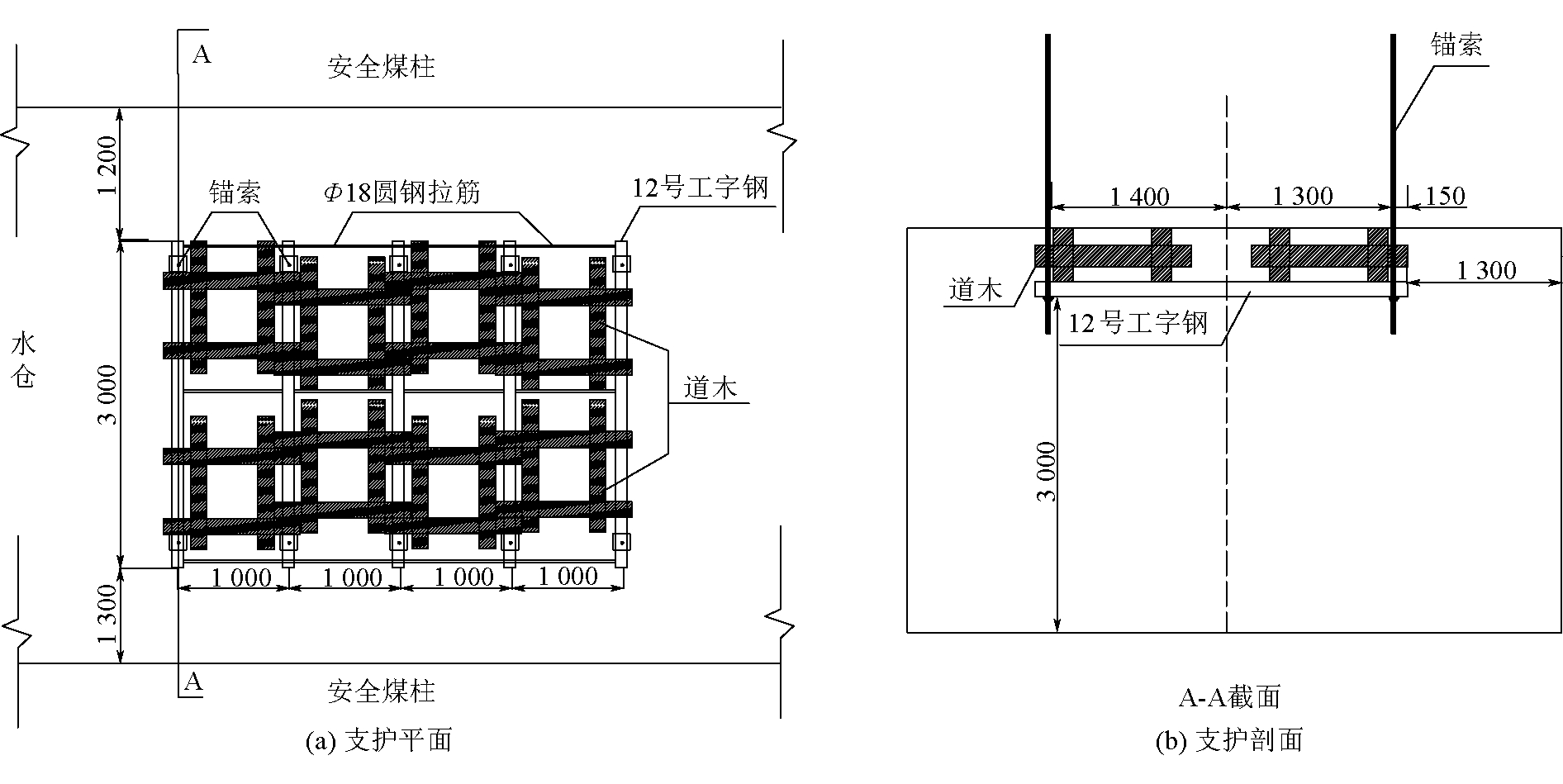 图8 单体液压支柱超前支护示意 3.3.3 水仓 由于水仓与巷道棱角处应力高度集中,同时水仓周围煤柱及底板长期浸水软化,导致煤体及岩体强度降低,故工作面过水仓时巷道围岩极易出现失稳,通常在水仓内支设单体支柱补强支护。但水仓底板需起底1.0~1.2 m,导致单体支柱不接顶或接顶不充分,需在水仓顶板施工锚吊梁支护,在工字钢下方支设单体支柱。其中锚吊梁施工采用锚索+12号工字钢+木垛支护方式,水仓锚吊梁支护平面及剖面如图9所示。