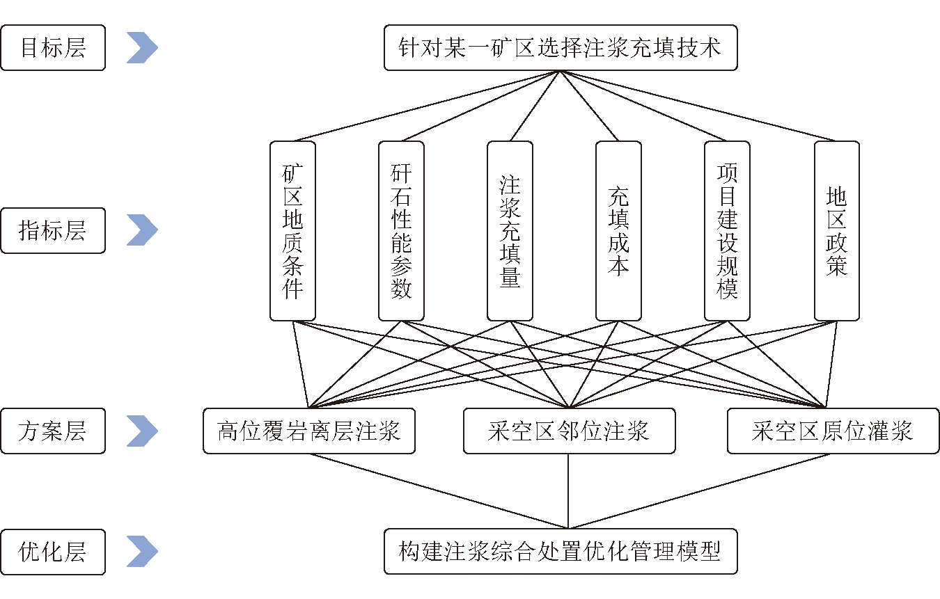 图3 采空区原位灌浆示意 采空区原位灌浆技术可以在不影响井下生产的前提下达到处置固废的目的,主要包括随采随灌和采后封闭灌浆这2种方法。采空区原位灌浆技术的原理与矿井防灭火中黄泥灌浆的技术原理类似,常应用于矿井防灭火。该项技术的优点在于技术成熟,不影响煤矿正常生产,但使用原位灌浆充填埋设管路的注浆量较小,不能保证达到设计煤矸石的处理量,无法实现核增产能部分煤矸石全部回填井下的目标。 3 注浆优化管理模型针对各个矿区所处地区地质条件、开采现状及开采方式的不同,适用的煤矸石规模化处置方式也有所不同,因此为找出适合的注浆充填方式,选择最适宜的注浆技术,可根据矿区的地质条件(含水层、隔水层、煤层埋深、开采方式、地层岩性)、矸石性能参数(粒径大小、硬度、岩性、含水率)、注浆充填量(注浆空间计算)、充填成本(前期建设费用、后期运营费用、电费及其他相关费用)、项目建设规模(根据矿方矸石产量及回填量设计注浆系统能力)、地区政策(西北地区要求矸石不能外运,需进行井下回填)等一系列因素综合分析、统筹规划,确定相应的注浆方案。此外结合矿区实际情况,高位覆岩离层注浆、采空区邻位注浆、采空区原位灌浆的不同注浆方案可相互组合并进一步优化,构成不同的浆体充填系统,构建注浆优化管理模型,最终可以得到矿区最优的注浆系统方案,达到规模化、无害化处理煤矸石的目标。注浆优化管理模型如图4所示。