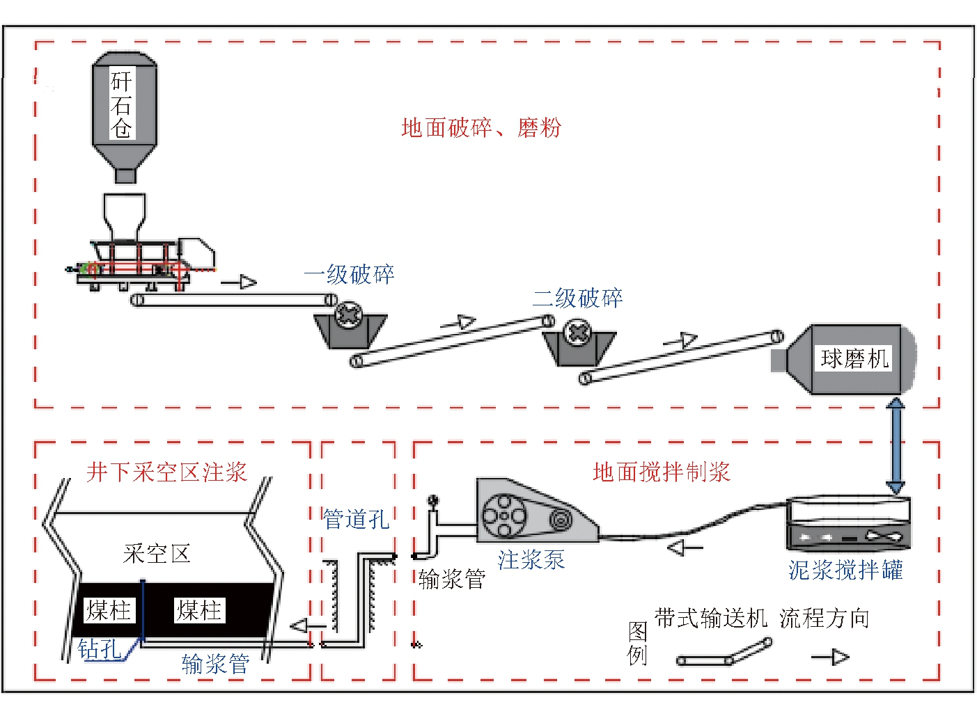 图5 蓄水池保护煤柱及减沉区域位置示意 此外,该矿煤矸石外运成本平均为34.78元/t,水处理站处理费用为14.24元/m3,根据近年来的市场行情走势,矸石和矿井水的处理费用还将逐年增高。通过实施本项目,在处理煤矸石的基础上可同时解决矿井水处置难题,综合处理单价可节约15.22元/t,相比于目前矿井处置同量的矸石和矿井水费用可节约成本1 369.80万元/a,同时可减免资源税,产生显著的经济效益。 4.2 唐家会煤矿采空区邻位注浆工程鄂尔多斯市华兴能源有限责任公司唐家会煤矿(以下简称“唐家会煤矿”)位于内蒙古自治区鄂尔多斯市准格尔旗大路镇,井田面积约28.57 km2,矿井生产能力为500万t/a,自2018年核增至900万t/a。目前煤矸石处置以外运为主,为积极响应国家及当地环保政策,利用主采6号煤层采动空间实施邻位注浆技术,建成处理能力100万t/a的注浆系统,解决煤矸石处置问题。 该矿采用垮落带井下注浆充填,煤矸石自地面矸石筒仓经带式输送机转运至地面注浆充填站,在注浆站内将煤矸石磨粉制成浆体,进入搅拌系统充分搅拌后,利用注浆泵加压泵入输浆管道输送至井下,通过施工邻位注浆钻孔注入地下冒落空间。煤矸石破碎制浆工艺流程如图6所示。