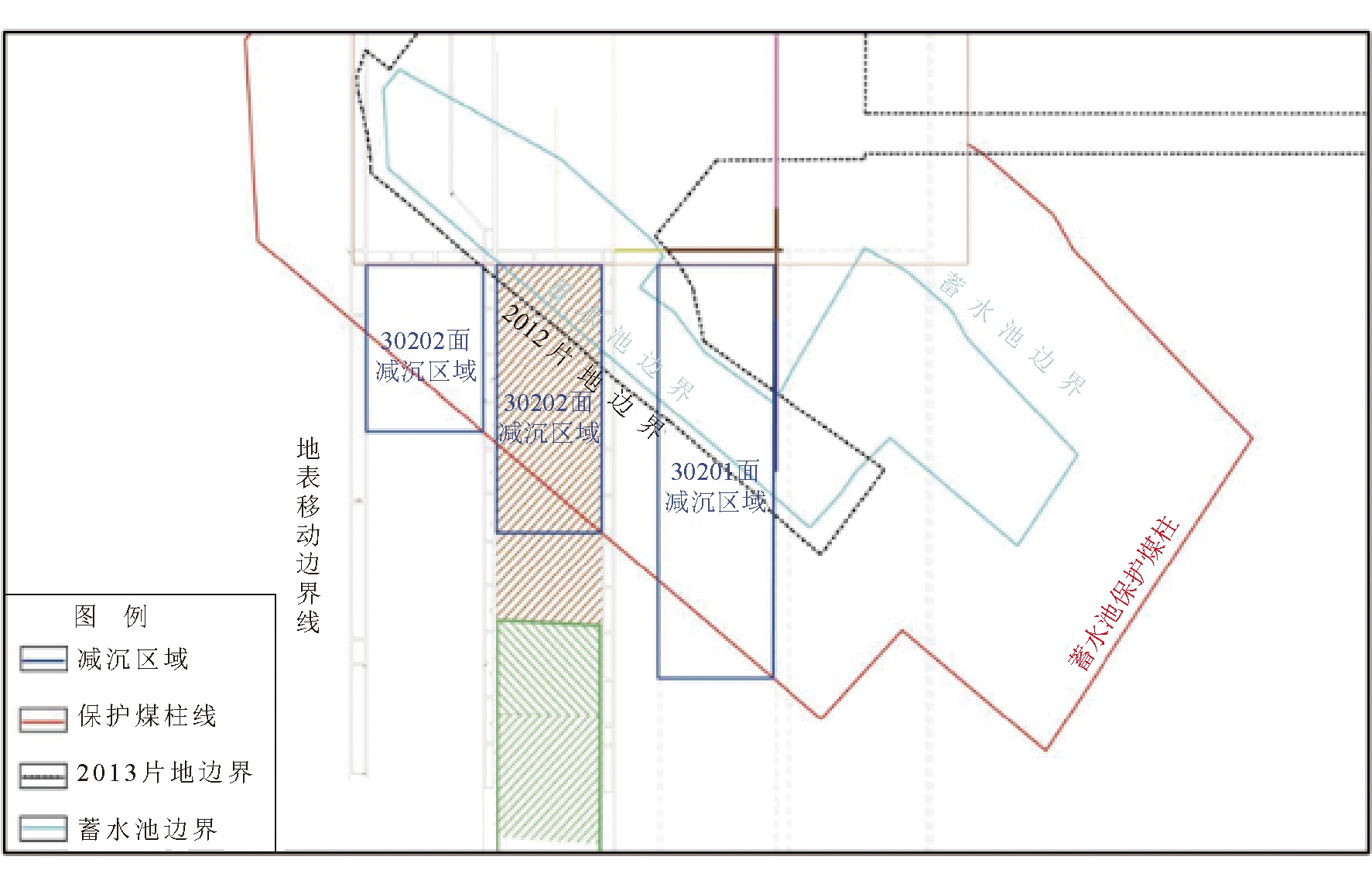图4 注浆综合处置优化管理模型 4 煤矸石井巷注浆充填典型工程案例4.1 母杜柴登煤矿高位离层注浆工程中煤西北能源有限公司母杜柴登煤矿位于内蒙古自治区鄂尔多斯市境内,为防止主采煤层3工作面上方蓄水池、环形铁路发生沉陷,该项目基于地下采动空间研究的基础上,利用破碎机、制砂机将煤矸石破碎加工,使用球磨机将其磨成粉状并制成浆液,通过高位离层注浆充填技术注入地下空间,达到了地面减沉效果,同时实现了对固废物(煤矸石)的无害化处理。 该项目于2021年10月16日进行设备整体调试及联合试运转,2022年1月正式开始注浆,该系统具备处理100万t/a煤矸石的条件,煤矸石小时处置量为152 t。截止目前,30202工作面减沉区域先期施工3个注浆孔,30201工作面北部先期施工1个钻孔,进行覆岩离层注浆,以控制该地段沉降的继续发生,施工过程中,矸石出料粒径控制在0.3 mm以下,浆液密度控制在1.0~2.0 g/cm3。蓄水池保护煤柱及减沉区域位置示意如图5所示。