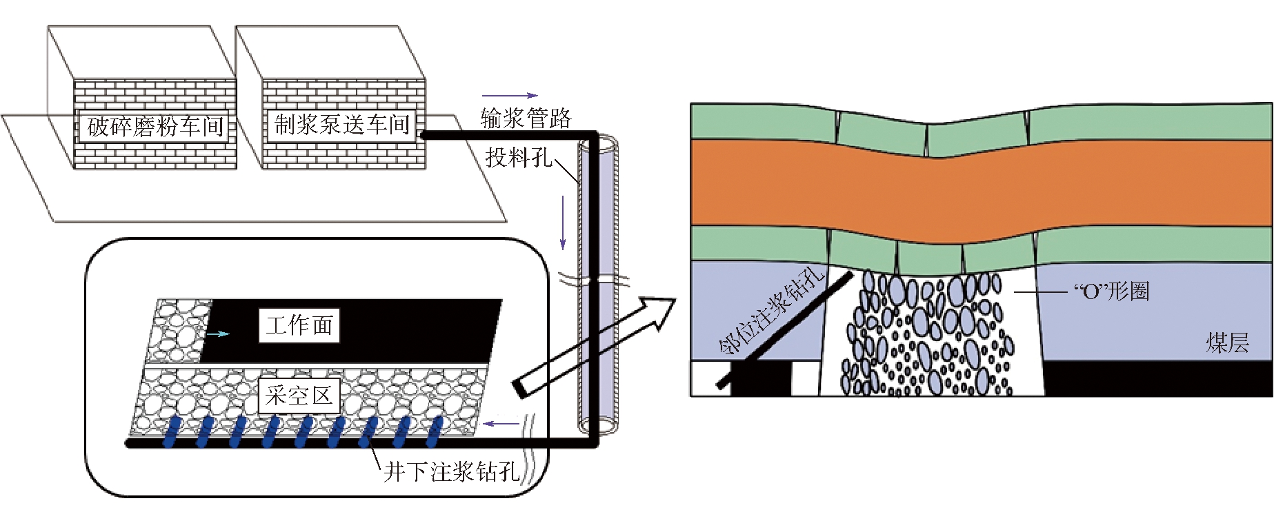 Research and application of integrated disposal technology of gangue grouting煤炭作为世界主要能源之一,在煤炭开采和选煤过程中会产生大量的煤矸石等固体废弃物,且该煤基固废居于工业固废之首[1-3]。目前,煤矸石的处置方式主要以堆积为主,该处置方式不仅占据了大量土地,同时也会对环境造成严重污染[4-6]。《中华人民共和国固体废物污染防治法》(2020年新修订)、《中华人民共和国循环经济促进法》《煤矿充填开采工作指导意见》等相关政策法规中明确指出,新建矿山不再设立永久矸石山,优先用于井下充填[7-9]。相关研究显示,煤矸石利用自身所含有机物提供燃料值,可进行一系列的综合利用[10-12],比如发电[13]、制作免烧砖[14]、水泥[15]等建筑材料、基建材料[16]以及矿区地下充填[17-18]。其中地下充填技术可充分利用地下空间,并有效实现煤矸石规模化处置[19-20]。 注浆充填技术作为地下充填的方式之一,具有成本低、不影响煤矿正常生产等优点,该技术将煤矸石作为注浆材料,通过地面钻孔注入到地下采动空间,将煤矸石从堆存转为利用,使其无害化、资源化,变废为宝,化害为利。基于此,笔者围绕煤矸石高位覆岩离层注浆、采空区邻位注浆、采空区原位灌浆三位一体综合处置技术,明确该技术原理、使用手段及使用条件,并通过工程实践证明,该技术可为矿区解决煤矸石处置提供借鉴。 1 煤矸石处置现状目前,我国煤矸石处置途径主要分2类,一类是无害化处置,一类是综合利用。无害化处置方式以地面回填(筑基填路、复垦造田等)和地下充填为主;综合利用方式主要包括发电、生产建材、分级分质利用(制作化工产品及生产肥料、聚合材物及复合材料、净水材料)等。由于地面回填和综合利用等处置方式处理量较小,无法匹配煤矸石的生产量,因此煤矸石规模化处理成为当前研究的热门课题之一。晋陕蒙等地区作为我国煤炭资源的富集区,属于重点开发区,随着这些地区矿产资源的不断开采,煤矸石产出数量也在不断增加。为了保护和改善矿区生态环境,防止固体废物污染环境,国家及地方出台了一系列的政策法规规范矿山治理,进一步推动煤基固废处理,其中地下充填技术就是实现煤矸石规模化处置大力推广的方式之一。 现阶段煤矸石地下充填技术主要包括固体充填、膏体(似膏体)充填和注浆充填这3种方式。其中固体充填和膏体充填技术需要设备较多、初期投资大,而且在充填过程中设备还需要不断外移、拆除、搭建等,煤矸石充填与煤矿生产还会相互干扰,不能同时进行,存在对煤矿生产影响大(煤炭产量低)等一系列问题,而且膏体充填方式需掺杂大量的添加剂,还会对环境产生一定影响,只适用于一些产能相对较小的矿井。而注浆充填技术成本较低且不含添加剂,对生产及环境影响较小。自2018年起,中煤地生态环境科技有限公司已在我国西北晋陕蒙地区成功实施了数十例注浆充填项目,产生了良好的经济、社会及环境效益。 2 煤矸石注浆综合处置技术原理及适用条件笔者提到的高位覆岩离层注浆、采空区邻位注浆、采空区原位灌浆综合处置技术均以煤矸石作为注浆原材料,但不仅限于煤矸石,也可将粉煤灰等煤基固废作为注浆原材料进行浆液制备。在技术应用过程中,可结合矿区水文地质条件、工作面开采情况、开采方式等,确定一种或多种注浆充填技术,有针对性地解决矿区存在的难题。在工程实施过程中,由于煤矸石采出时的粒径较大,因此在处置煤矸石前,需借助成套的破碎球磨设备,将煤矸石破碎球磨到一定粒径,再与水按照一定比例混合,保证浆液密度在1~2 g/cm3之间,最后将煤矸石制成的浆液通过地面钻孔经管道注入到地下采动空间。 2.1 高位覆岩离层注浆技术高位覆岩离层注浆技术的原理是通过施工探查孔,查明煤层开采后上覆岩层内“两带”发育高度及离层发育规律和分布特征,基于岩层移动的覆岩采动关键层理论,利用煤层开采后覆岩开裂过程中形成的离层空间,从地表钻孔将煤矸石制成的浆液注入到关键层以下的离层内,形成“离层区充填体+关键层+煤柱”构成的共同承载体。在处理煤矸石的同时,还可对地表形成有效支撑,减少地表沉降。高位覆岩离层注浆示意如图1所示。