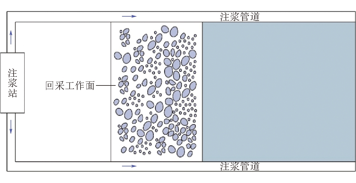 图2 采空区邻位注浆示意 邻位注浆充填技术适用条件如下: (1)需具有一定的冒落充填空间,满足邻位注浆充填需求; (2)回采工作面顶板岩性及厚度需满足要求,顶板冒落塌陷时间不能太快,否则不具备注浆时间; (3)井下钻探工程施工要求高,隔离煤柱需达到一定厚度。 邻位注浆充填既可应用于正在回采的工作面实现随采随充,同时也可通过在大巷或停采线内施工仰上钻孔作为老空区浆体充填的技术手段,实现采后充填。但该技术钻探工程主要在井下进行,钻孔钻进需经过煤柱、岩层及采空区垮落空间3种介质。钻孔属于仰上钻孔,受地应力及重力因素的影响,常会出现塌孔等现象。为了提高钻进效率不影响后续邻位注浆充填作业,因此对钻进工艺要求较高。 2.3 采空区原位灌浆技术采空区原位灌浆技术的原理是在地面建设注浆系统,回采工作面两侧埋设注浆管道,利用注浆泵将制好的浆液输送到井下工作面进行滞后注浆,并布设封堵墙控制浆液的扩散范围,采空区原位灌浆示意如图3所示。