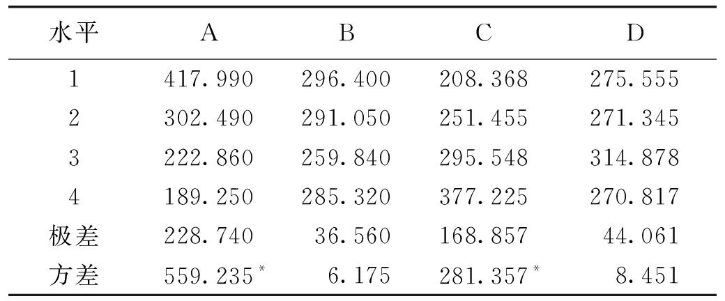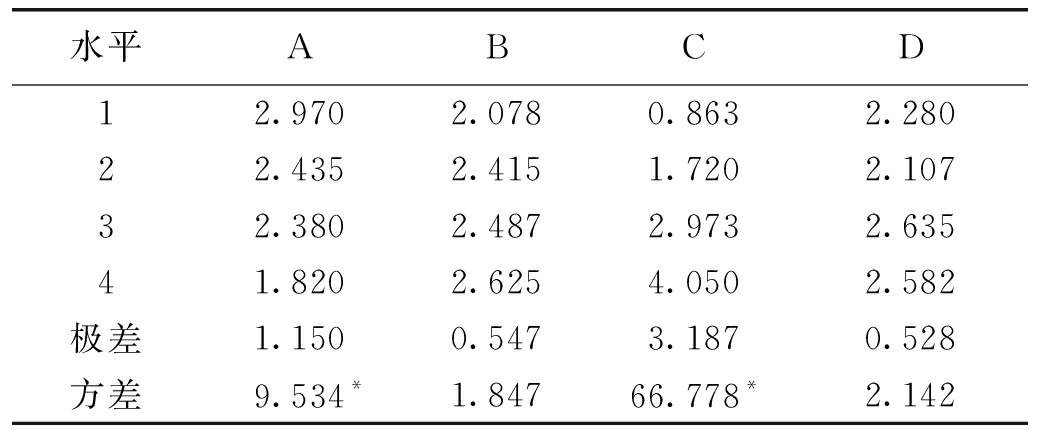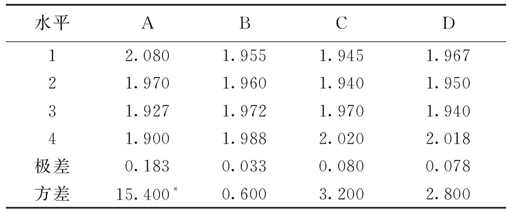 试验编号密度/(g·cm-3)抗压强度/MPa弹性模量/MPa吸水率/%12.010.96344.7115.2622.032.02379.176.8832.073.66443.043.3542.215.24505.052.3851.911.88318.922.4062.000.89227.511.8572.034.06362.4412.6281.942.91301.104.9191.972.82232.953.01101.914.25352.415.79111.900.85116.114.11121.931.60189.9713.63131.932.65289.0018.27141.902.50205.1023.55151.891.38117.765.57161.870.75145.1412.02 由表3可以看出,相似材料的密度范围是1.87~2.21 g/cm3,单轴抗压强度的范围是0.75~5.24 MPa,弹性模量的范围是117.76~505.05 MPa,吸水率的范围是1.85%~23.55%。 为获取材料各性质的影响规律,笔者通过极差分析法和方差分析法对各指标进行了因素分析。其中,极差分析法是通过对每一因素的极差来分析问题,极差大小反映了该因素选取不同水平变动对指标的影响大小,极差大说明此因素的不同水平产生的差异较大,是重要因素,对试验结果影响明显[19-20];方差分析的目的是找出对事物有显著影响的因素,指明各因素间的交换作用以及显著影响因素的最佳水平[21]。 3.1 密度影响因素分析材料密度极差和方差分析见表4。 表4 材料密度极差和方差分析 g/cm3