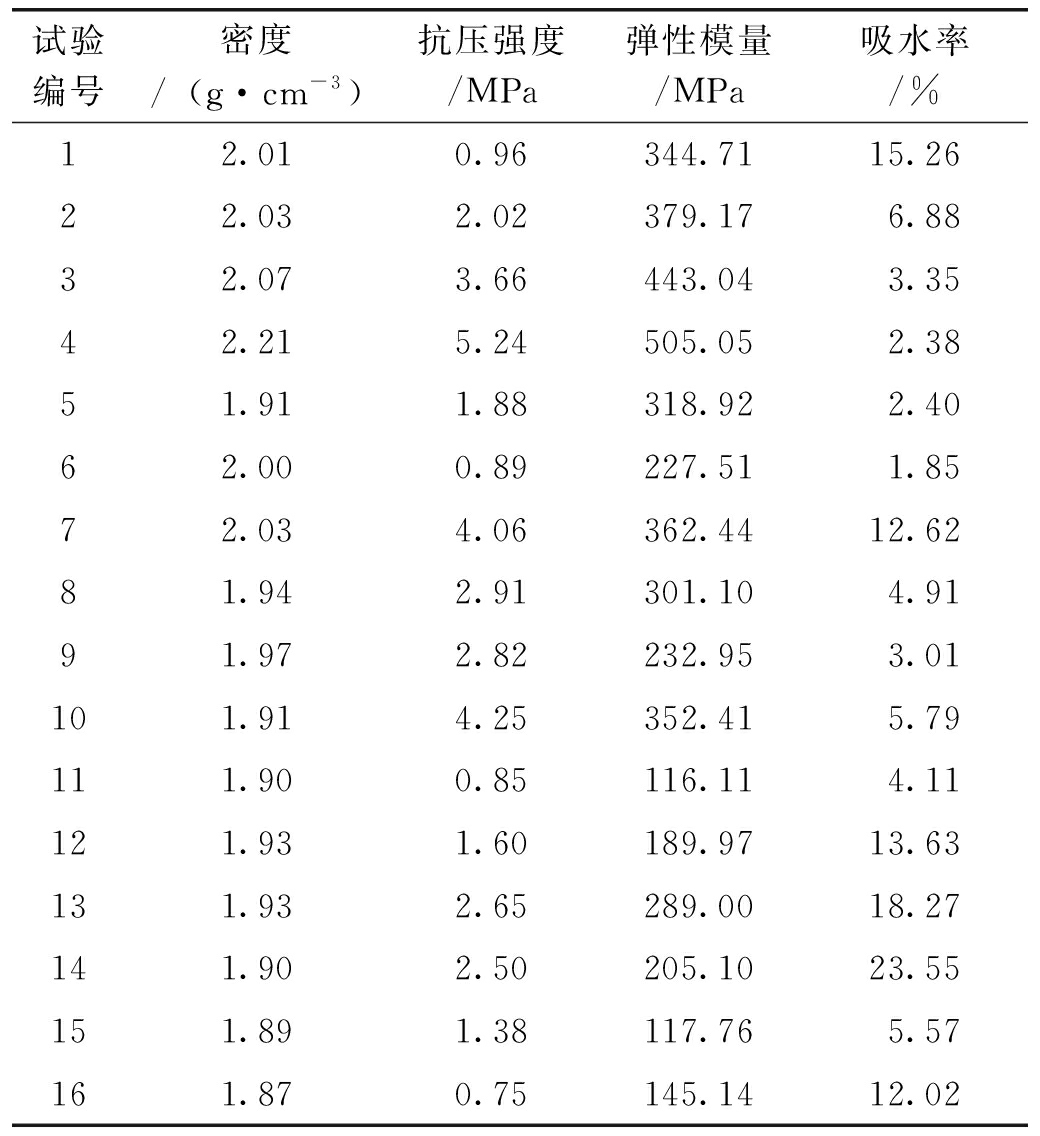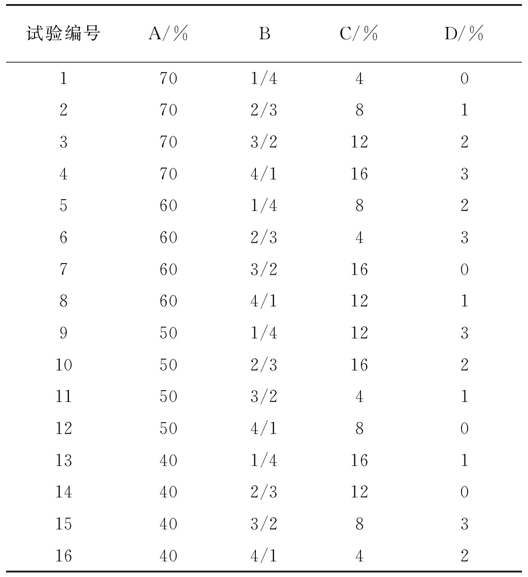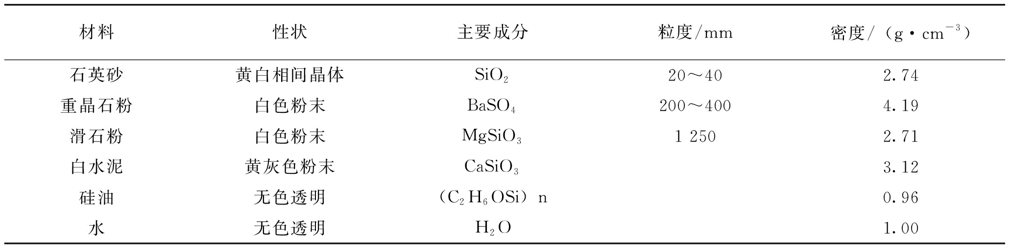 材料性状主要成分粒度/mm密度/(g·cm-3)石英砂黄白相间晶体SiO220~402.74重晶石粉白色粉末BaSO4200~4004.19滑石粉白色粉末MgSiO31 2502.71白水泥黄灰色粉末CaSiO33.12硅油无色透明(C2H6OSi)n0.96水无色透明H2O1.00 2.2 试验方案本试验采用正交试验设计法。正交试验设计是研究多水平、多因素的试验设计方法,是从全面试验中选取部分具有代表性的点进行试验,通过最少的试验次数达到理想效果,找到对试验结果最敏感的因素[16]。 试验选取石英砂含量、重晶石粉含量、水泥含量、硅油含量4个正交设计因素,具体如下:A因素是石英砂质量/骨料总质量,B因素是重晶石粉质量/滑石粉质量,C因素是水泥质量/总质量,D因素是硅油质量/总质量。对A因素设置4个水平为70%、60%、50%和40%;对B因素设置4个水平为1/4、2/3、3/2和4/1;对C因素设置4个水平为4%、8%、12%和16%;对D因素设置4个水平为0、1%、2%和3%。选用五因素四水平正交设计方案L16(45),基于正交试验设计的配比方案见表2。 表2 基于正交试验设计的配比方案