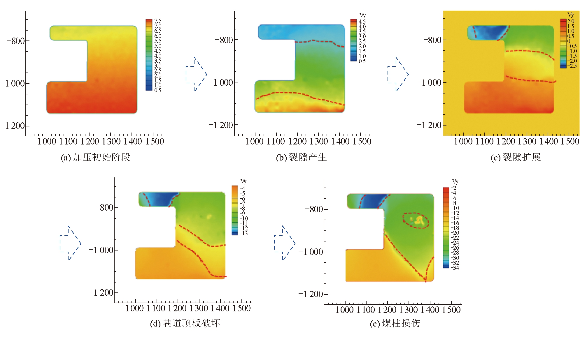 图8 煤柱位置及数据提取范围 在煤层回采模拟过程中,利用数字照相技术监测煤柱坝体破坏前后煤柱坝体的位移量及裂隙演化规律。分析得出,煤柱坝体裂隙发育经过初始加压阶段、裂隙产生、裂隙扩展、巷道顶板破坏和煤柱损伤5个阶段,覆岩裂隙发育情况如图9所示。