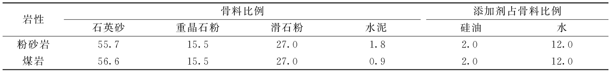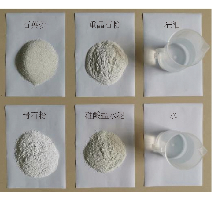 图1 相似材料原材料 石英砂作为骨料可以起到骨架和支撑作用,重晶石粉和滑石粉主要起到增加材料堆积密度和降低变形模量和抗压强度的作用,适量的水泥和水主要起胶凝作用,硅油主要起到使试件遇水不崩解的作用,其粘度为1 000 cs。以上材料来源广、成本低且无毒无害,满足相似材料制作的基本要求。各类材料基本参数见表1。 表1 相似材料的原材料基本参数