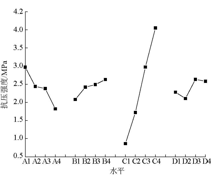 水平ABCD12.9702.0780.8632.28022.4352.4151.7202.10732.3802.4872.9732.63541.8202.6254.0502.582极差1.1500.5473.1870.528方差9.534*1.84766.778*2.142 注:*代表影响因素显著 由表5可以看出,极差分析和方差分析具有一致的结论,即各影响因素的敏感性从高到低为C-A-B-D,其中B、D因素的极差值和方差值差别不大。这说明C因素具有显著调节作用,A因素次之,B、D因素具有轻微调节作用。各因素对抗压强度的影响规律如图4所示。