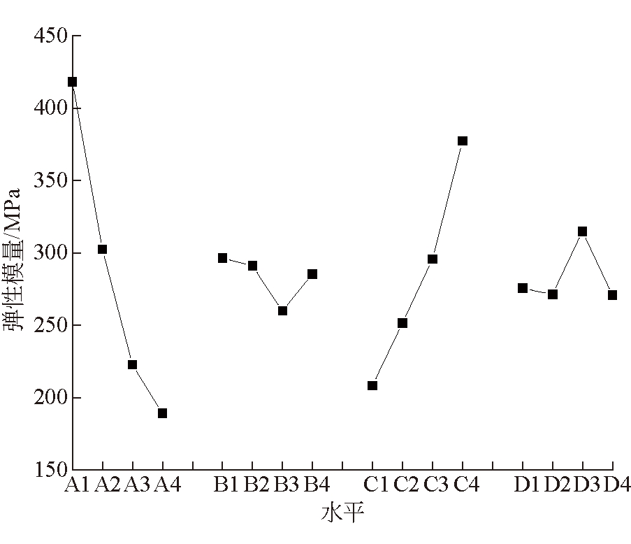 水平ABCD1417.990296.400208.368275.5552302.490291.050251.455271.3453222.860259.840295.548314.8784189.250285.320377.225270.817极差228.74036.560168.85744.061方差559.235*6.175281.357*8.451 注:*代表影响因素显著 由表6可以看出,极差分析和方差分析具有一致的结论,即各因素敏感性由高到低为A-C-D-B,其中A、C因素的极差值和方差值都很大,B、D因素的极差值和方差值都很小。这说明A、C因素具有显著调节作用,B、D因素具有轻微调节作用。各因素对弹性模量影响规律如图5所示。