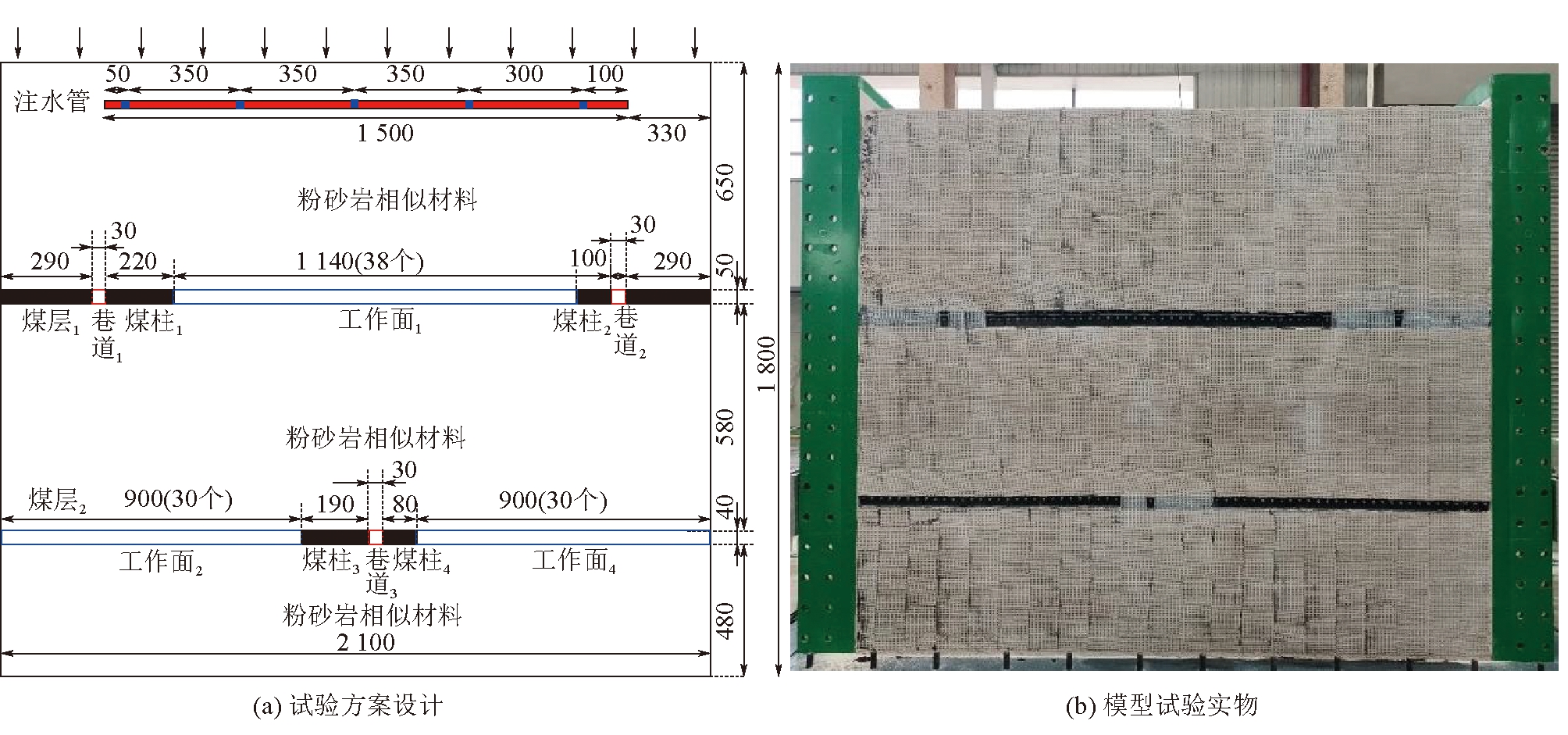图6 各因素对吸水率的影响规律 由表7和图6可以看出,吸水率随硅油含量增大而减小,随石英砂含量增大而大致呈增大趋势,与重晶石粉含量、水泥含量相关性较差。 4 相似材料性能验证试验为研究煤矿地下水库煤柱坝体失稳破坏前兆信息,确定评判煤柱坝体稳定性的核心指标,以神东矿区大柳塔煤矿地下水库为工程背景,采用本文研发的煤岩体流固耦合相似材料开展了多煤层开采煤矿地下水库模拟试验。 试验中,模型尺寸宽×高×厚为2 100 mm×1 800 mm×300 mm。根据拟模拟现场范围及试验模型尺寸确定模型试验的几何相似比尺取1∶150,时间相似比尺取1∶13,进而确定强度相似比尺取1∶150,弹性模量相似比尺1∶150。根据原岩物理力学性质(见表8)、相似比尺及相似材料各性质影响规律,相似材料配比见表9。 表8 原岩及相似材料性质