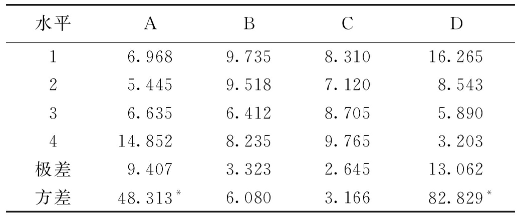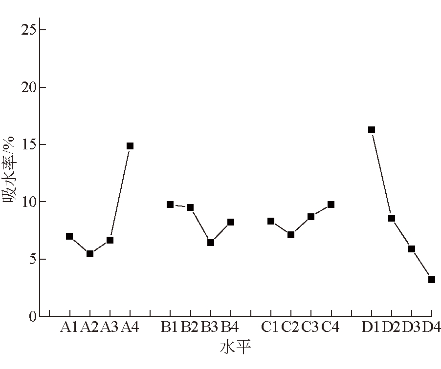 水平ABCD16.9689.7358.31016.26525.4459.5187.1208.54336.6356.4128.7055.890414.8528.2359.7653.203极差9.4073.3232.64513.062方差48.313*6.0803.16682.829* 注:*代表影响因素显著 由表7可以看出,极差分析和方差分析具有一致的结论,即各因素的敏感性从高到底为D-A-B-C,其中A、D因素的极差值和方差值都很大,B、C因素的极差值和方差值都很小。这说明D因素具有显著调节作用,A因素次之,B、C因素具有轻微调节作用。各因素对吸水率的影响规律如图6所示。