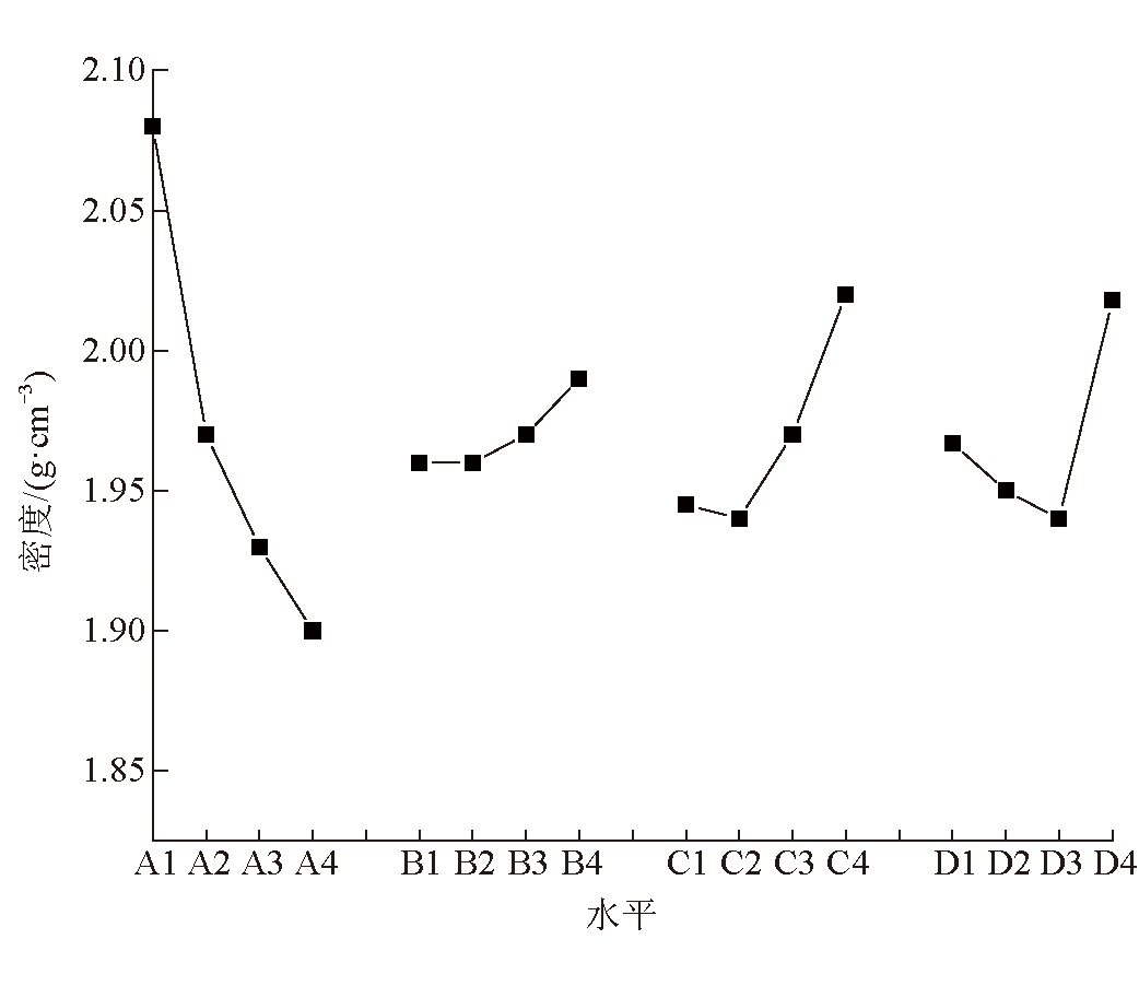 水平ABCD12.0801.9551.9451.96721.9701.9601.9401.95031.9271.9721.9701.94041.9001.9882.0202.018极差0.1830.0330.0800.078方差15.400*0.6003.2002.800 注:*代表影响因素显著 由表4可以看出,极差分析和方差分析具有一致的结论,即各影响因素的敏感性从高到低为A-C-D-B,其中B、C、D因素的极差值和方差值差别不大。这说明A因素具有显著的调节作用,B、C、D具有轻微调节作用。 为了更直观地分析各因素对密度的影响规律,根据表4做出了各因素对密度影响的直观分析图,各因素对密度影响规律如图3所示。
