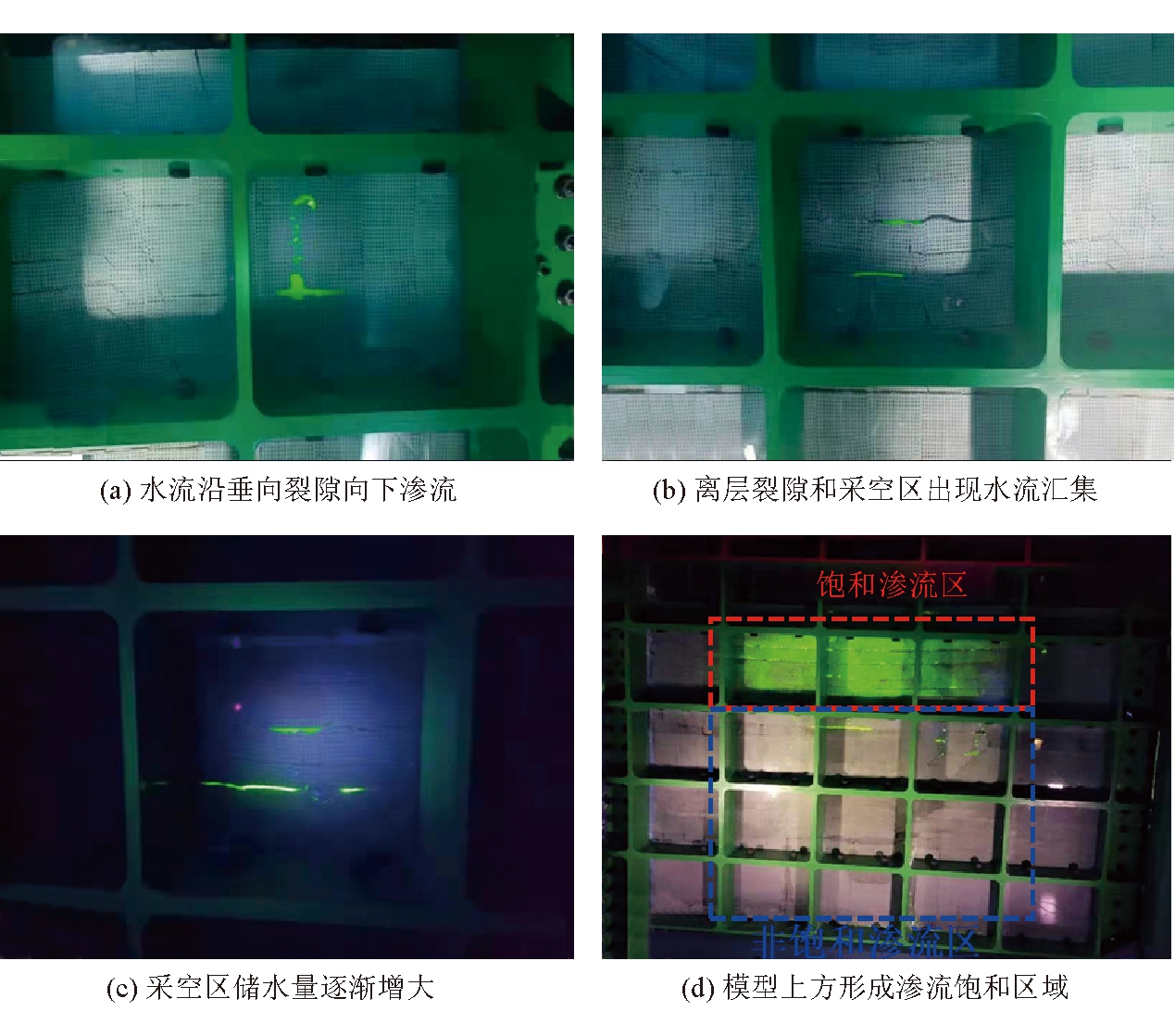 图9 覆岩裂隙发育情况 (1)初始加压阶段。在初始加压阶段,煤柱坝体及周围岩体未受到影响,通过处理结果可以看出,初始阶段未见明显裂隙产生。 (2)裂隙产生阶段。在顶部压力不断增加的影响下,位于煤柱坝体和巷道侧顶角部位开始有裂隙出现(图中红色点线),同时煤柱坝体及巷道底板也有裂隙产生。 (3)裂隙扩展阶段。随着压力的不断增加,位于巷道正上方产生肉眼可见的裂隙,并在煤柱中间部位有裂隙产生。 (4)顶板破坏阶段。该阶段巷道顶板处裂隙不断扩展,并在巷道顶角处出现片帮现象,煤柱中间部位裂隙逐渐向底角发育。 (5)煤柱损伤阶段。该阶段顶板出现严重片帮,裂隙不断向巷道上部岩层扩展,煤柱裂隙发育;在底角附近斜切向采空区扩展,煤柱中间靠近采空区附近开始出现新的裂隙发育(黑色点线内)。 上述煤柱坝体裂隙发育过程与理论分析结果及现场实际情况一致,验证了该相似材料模拟煤层回采过程顶板岩层破坏及煤柱损伤的可行性[22-23]。 煤层回采完成后,从模型顶部进行注水,分析开采裂隙场水流下渗情况。在水体内混合荧光粉,并配合紫外线灯光进行水体运移监测,模型注水渗流示踪效果如图10所示。