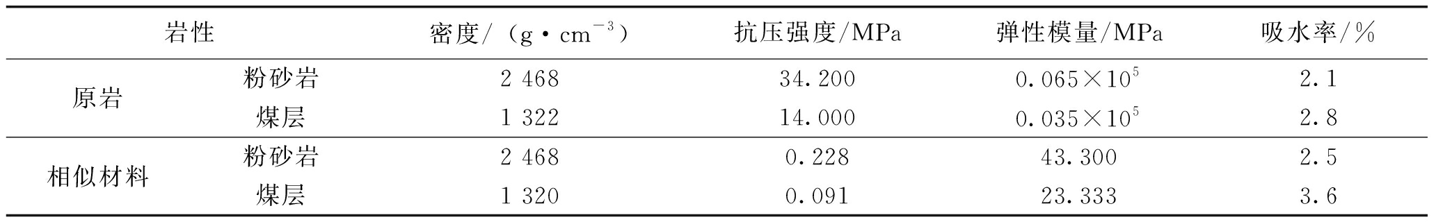 岩性密度/(g·cm-3)抗压强度/MPa弹性模量/MPa吸水率/%原岩粉砂岩2 46834.2000.065×1052.1煤层1 32214.0000.035×1052.8相似材料粉砂岩2 4680.22843.3002.5煤层1 3200.09123.3333.6 表9 相似材料配比 %
