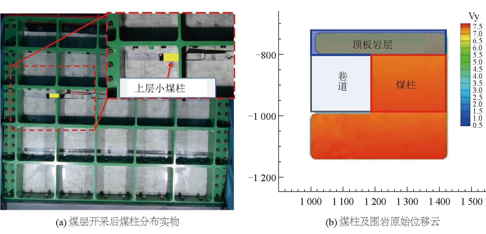 图7 试验模型 根据神东矿区大柳塔煤矿的实际生产情况,模拟试验过程依次为初始地应力施加、上部煤层回采、下部煤层回采、模型顶部注水。为客观分析顶部加载过程中煤柱坝体裂隙发育规律,发现细微裂隙及运移特征,利用DAVIS软件得出煤柱及周边岩层位移状态,进而对煤层开采后及加压过程中上层小煤柱裂隙进行分析,研究煤柱坝体及其周围岩体裂隙发育规律。煤柱位置及数据提取范围如图8所示。