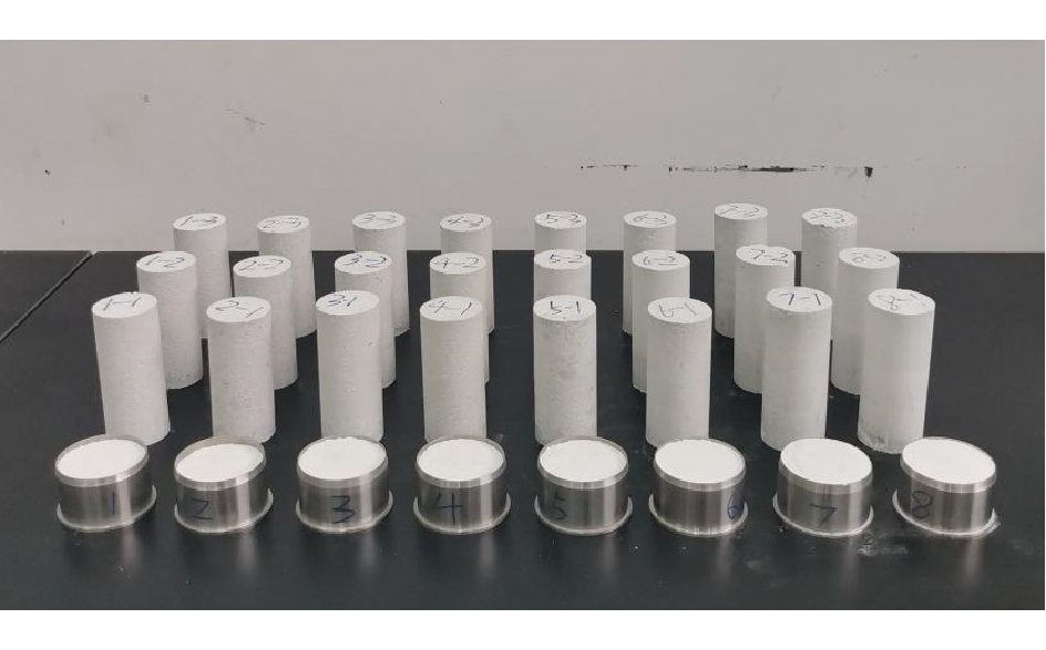 试验编号A/%BC/%D/%1701/4402702/3813703/21224704/11635601/4826602/3437603/21608604/11219501/412310502/316211503/24112504/18013401/416114402/312015403/28316404/142 试验测定了材料的密度、单轴抗压强度、弹性模量和吸水率。其中,吸水率是煤岩体重要的水理性性质,吸水率越小非亲水性越强[12]。各参数的测定方法参照《煤和岩石物理力学性质测定方法》(GB/T 23561-2009)。 2.3 材料制作工艺为保证相似材料试件的均匀性和密实度,并与模型试验材料的性质保持一致,相似材料试件采用振动夯实的方式成型。采用双开模具制作相似材料试件,试件尺寸的高度为100 mm,直径为50 mm。每组同组分同规格的试件制作3个,共计48个。 试件的具体制作工艺如下:首先按照试验方案称取石英砂、重晶石粉、滑石粉、白水泥、硅油和水,并将干料混合、搅拌均匀(不少于60 s);其次将称量好的水加入干料中,搅拌60 s后加入硅油,而后继续搅拌均匀(不少于120 s);再次将搅拌好的混合料分多次加入钢制模具内,利用电动平板夯振动压实(不少于60 s);最后拆除模具,并将振实成型的相似材料试件在20 ℃的恒温环境中养护,直至试件完全干燥。养护中的试件如图2所示。