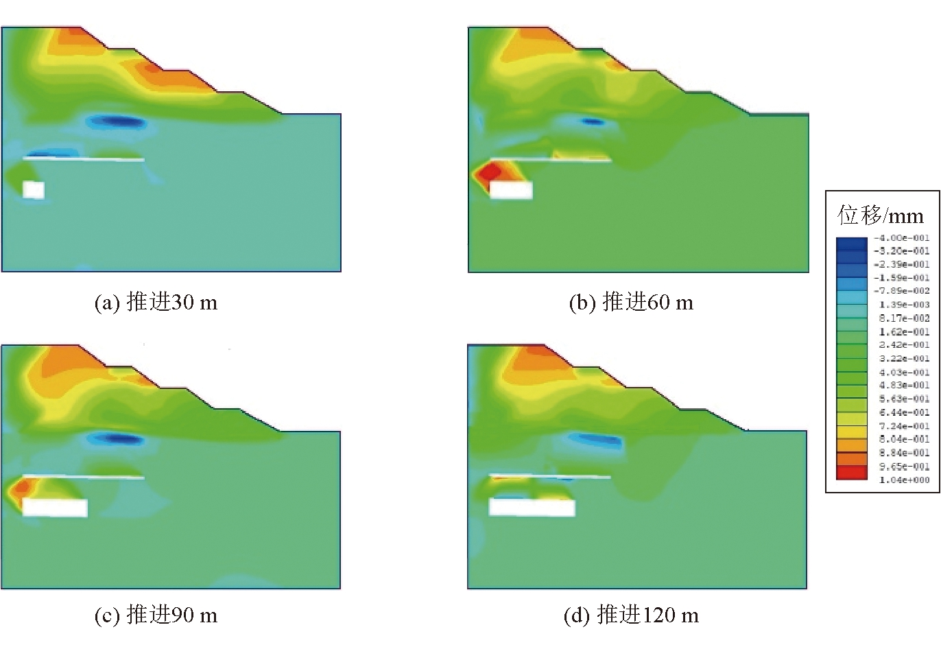 图3 4号煤层工作面在不同推进距离下边坡水平位移云图