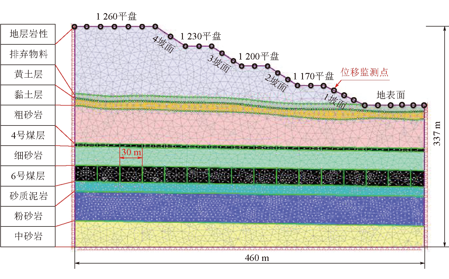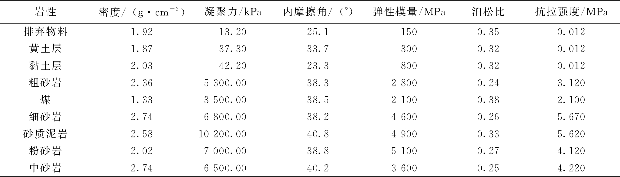 岩性密度/(g·cm-3)凝聚力/kPa内摩擦角/(°)弹性模量/MPa泊松比抗拉强度/MPa排弃物料1.9213.2025.11500.350.012黄土层1.8737.3033.73000.320.012黏土层2.0342.2023.38000.320.012粗砂岩2.365 300.0038.32 8000.243.120煤1.333 500.0038.52 1000.382.100细砂岩2.746 800.0038.24 6000.265.670砂质泥岩2.5810 200.0040.84 9000.335.620粉砂岩2.027 000.0038.85 1000.274.120中砂岩2.746 500.0040.23 6000.254.220