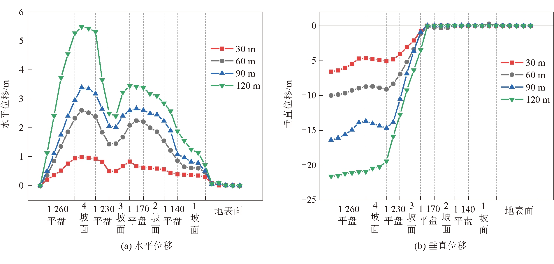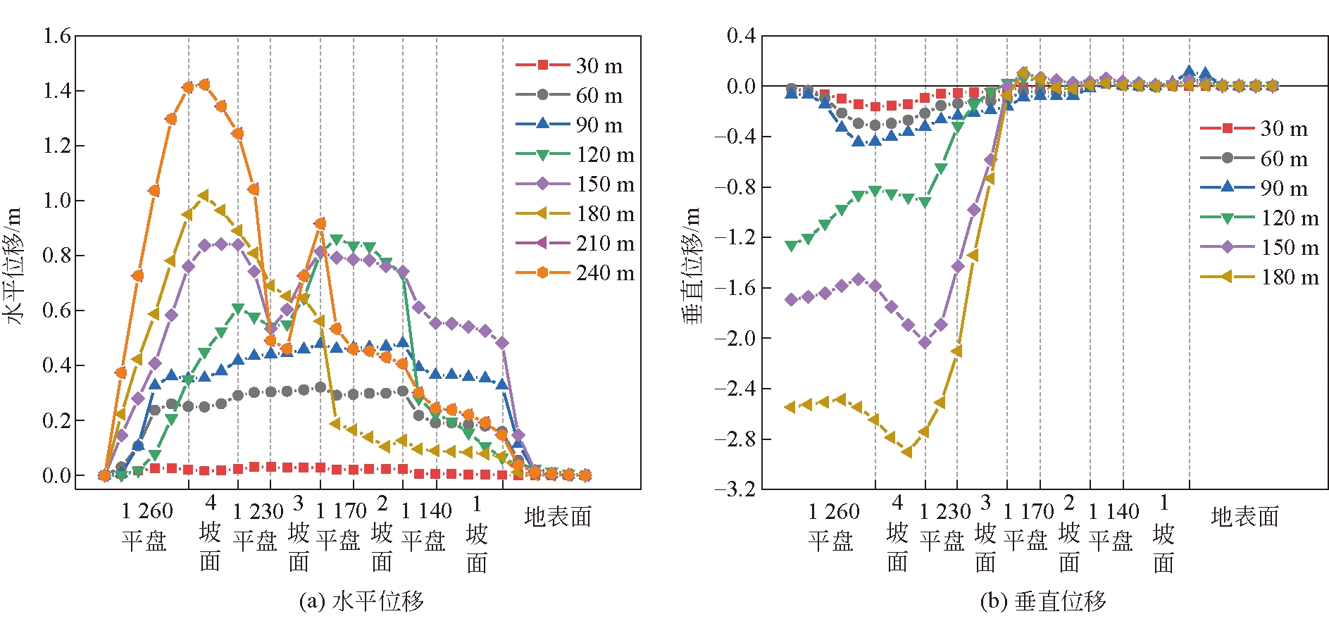 图2 数值计算模型及边界条件示意 由于矿区排土场下需要开采4号和6号煤层,煤层开采选择下行开采顺序,因此,数值计算时,首先回采4号煤层,确定4号煤层终采线位置后,再回采6号煤层并确定其终采线位置。工作面每次回采30 m,分析采动对边坡位移场、最大剪应力和安全系数等的影响。此外,为了直观反映边坡的移动变形特征,定量描述边坡的位移变形量,在边坡的各台阶和各个坡面上共设置30个测点。 3 4号煤层开采对边坡稳定性的影响3.1 边坡位移变化特征4号煤层工作面在不同推进距离下边坡水平位移和垂直位移云图如图3和图4所示;4号煤层工作面在不同推进距离下边坡监测点水平位移和垂直位移的变化曲线如图5所示。 由图3~图5可以得出以下结论。