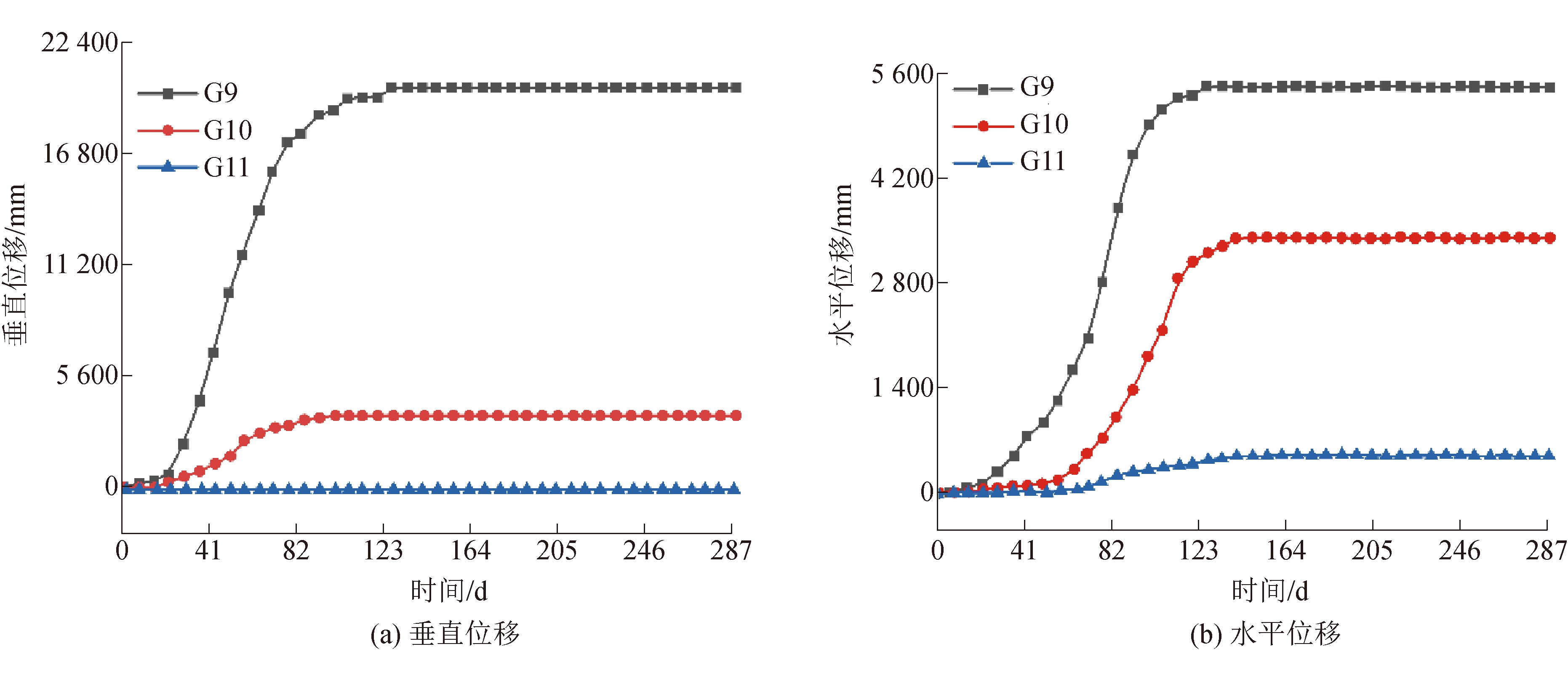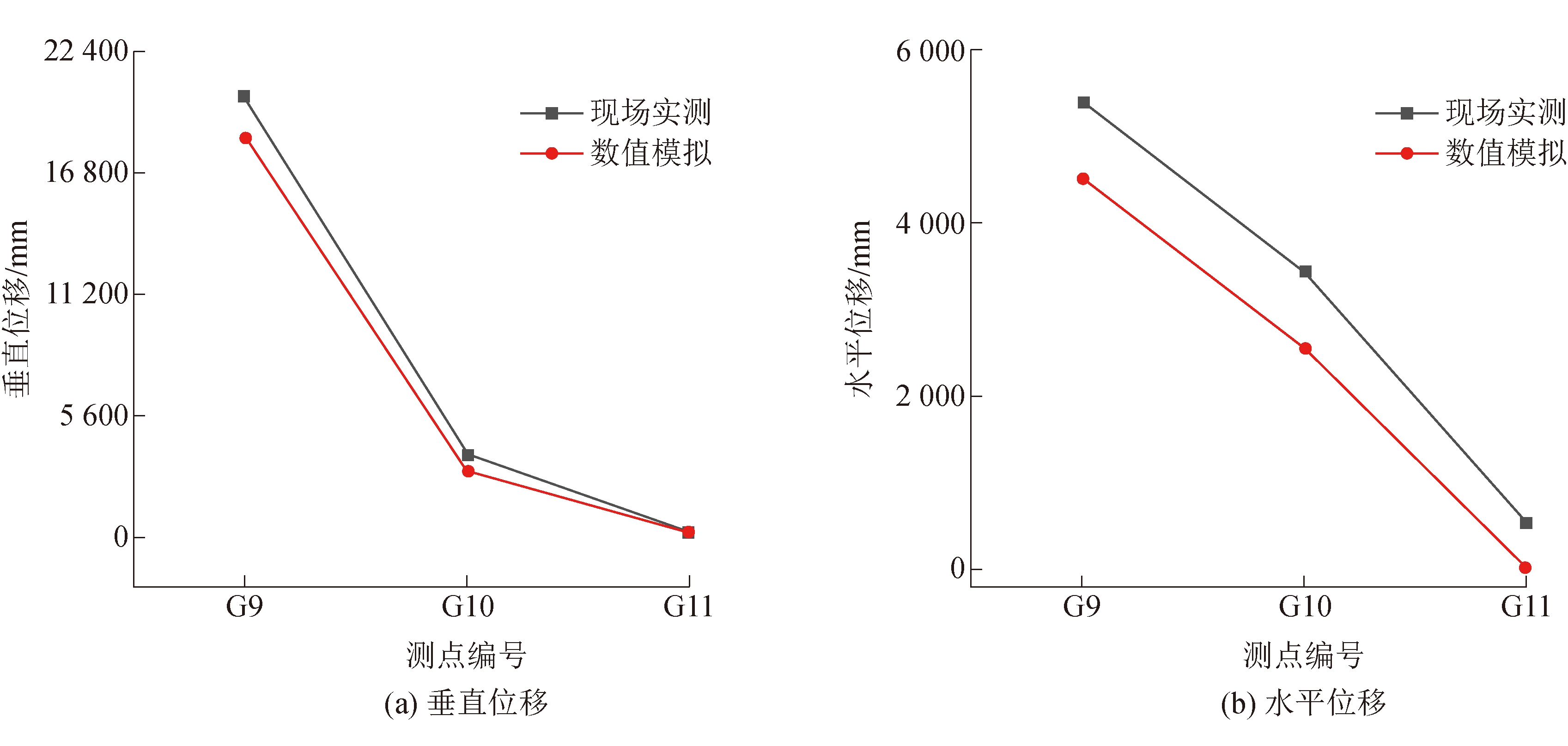 图13 各测点位移随时间变化曲线 提取数值计算模型中对应G9、G10和G11监测点的垂直位移和水平位移,与现场实测数据进行对比,结果如图14所示。