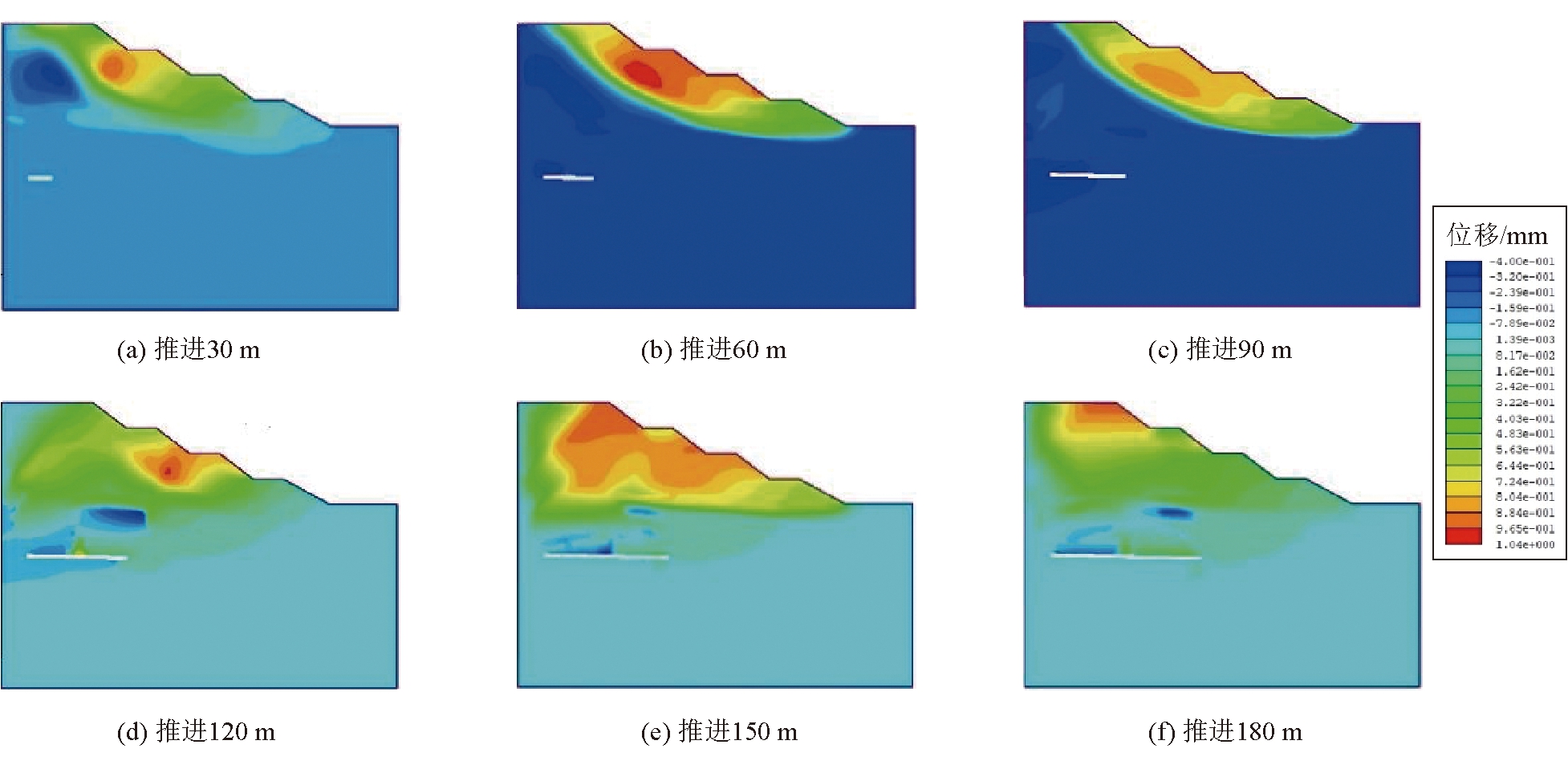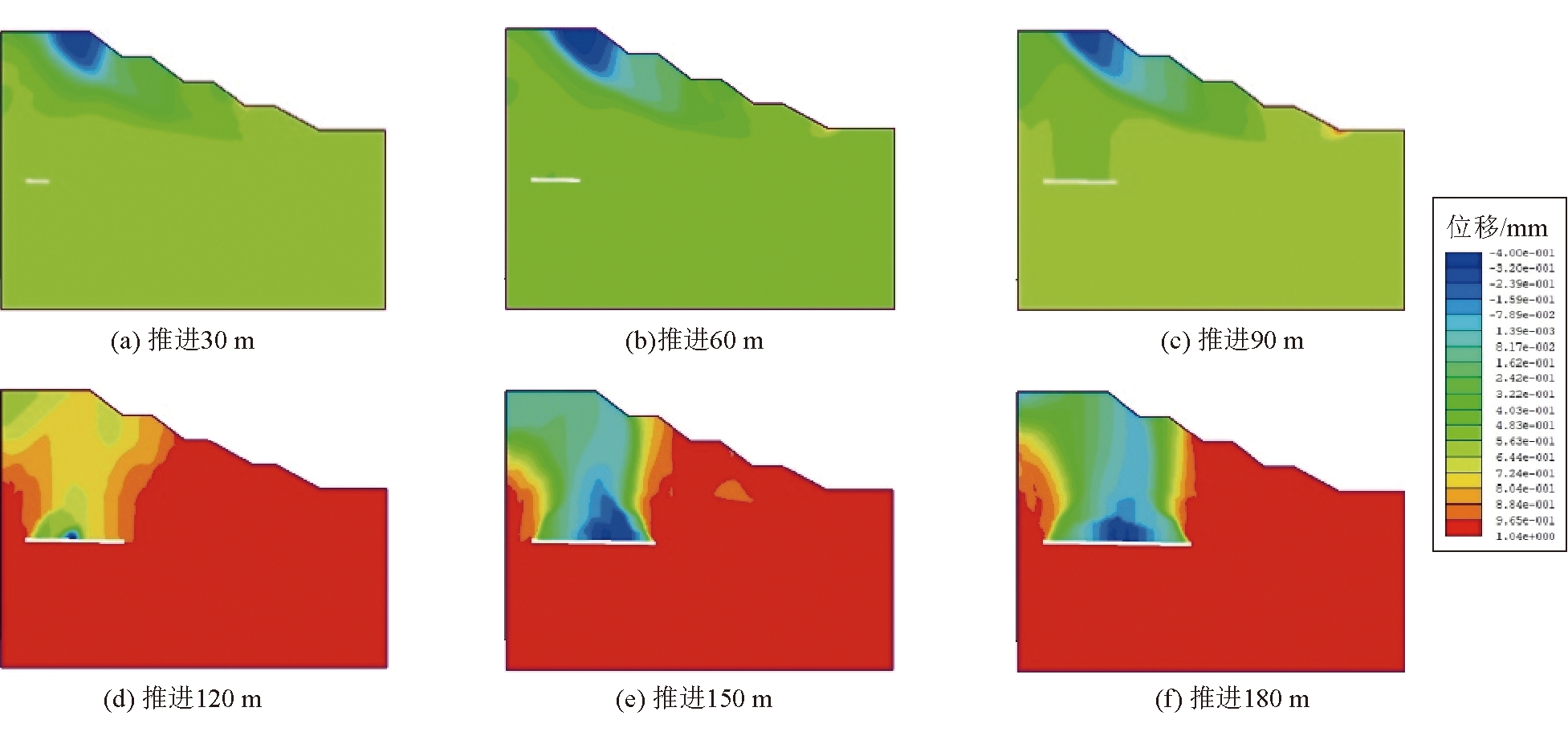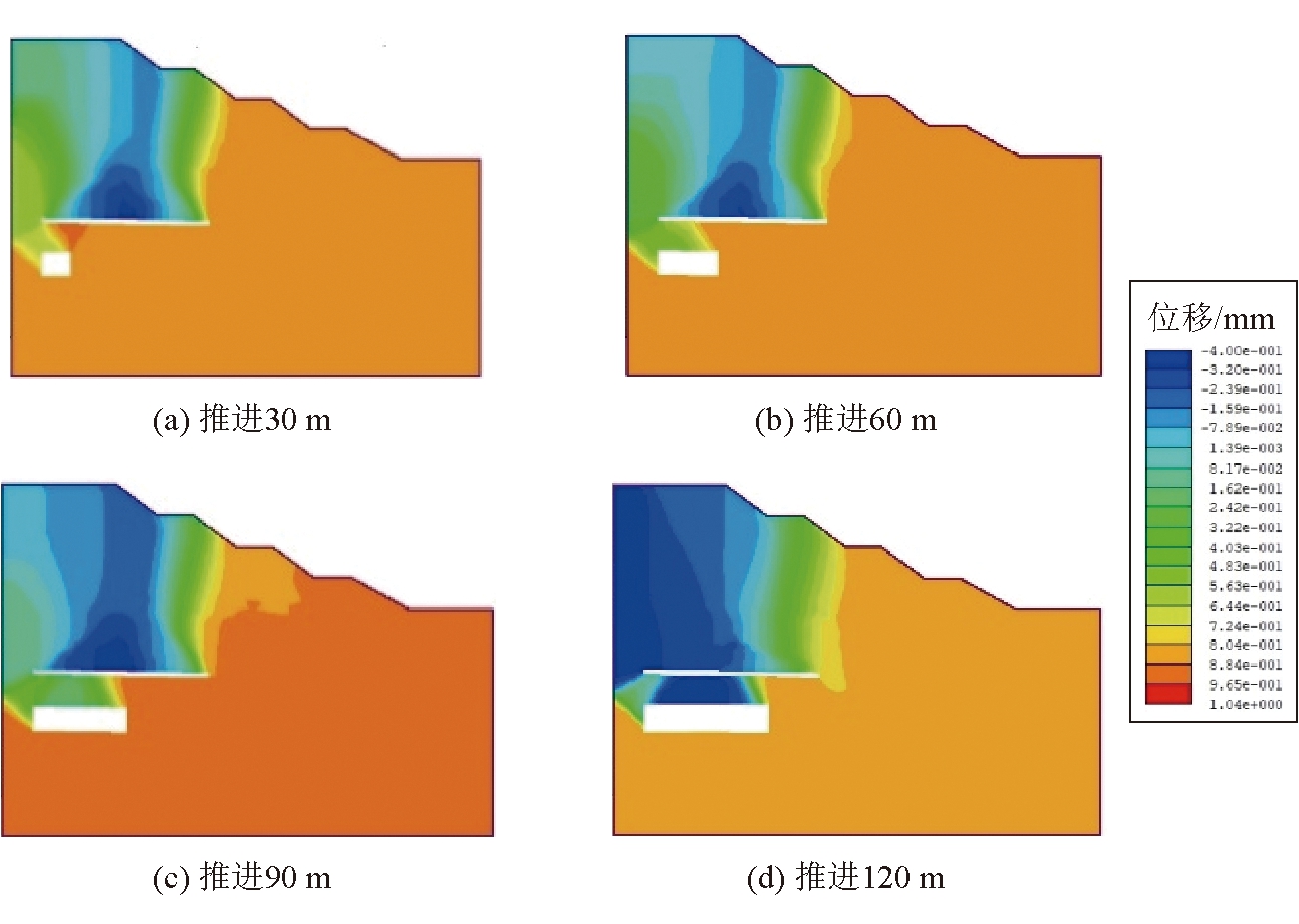 图7 4号煤层推进过程中安全系数及终采线位置 4 6号煤层开采对边坡稳定性的影响4.1 边坡位移变化特征6号煤层工作面在不同推进距离下边坡水平位移和垂直位移云图如图8和图9所示;6号煤层工作面在不同推进距离下边坡监测点水平位移和垂直位的变化曲线如图10所示。