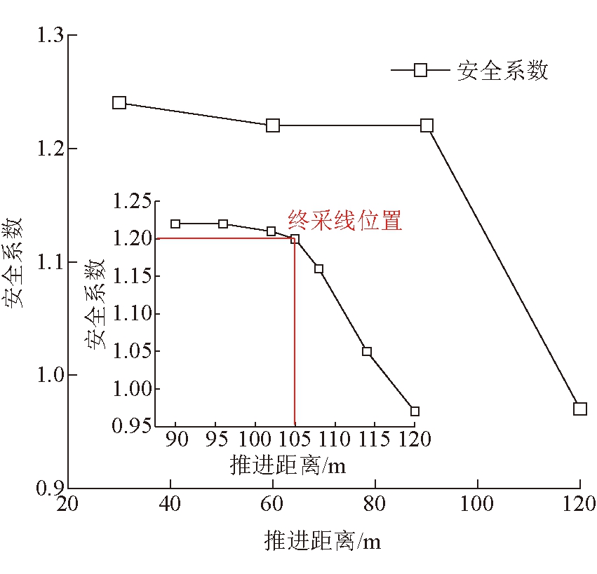 图11 6号煤层工作面推进过程中最大剪应变云图 4.3 安全系数及终采线位置6号煤层推进过程中安全系数及终采线位置如图12所示。 由图12可知,边坡安全系数随着工作面推进距离的增加呈现先缓慢减小后快速减小的变化规律,当推进距离由30 m增至90 m时,该阶段边坡安全系数受采动影响较小,安全系数由1.24降至1.22,降幅仅为1.61%;当推进距离由90 m增至120 m时,安全系数由1.22降至0.97,降幅为20.49%,这表明采动对边坡安全具有显著影响。为满足边坡安全系数大于1.2的要求,6号煤层工作面推进距离最大为105 m,即距离1 260平盘坡顶线右侧的水平距离为35 m。