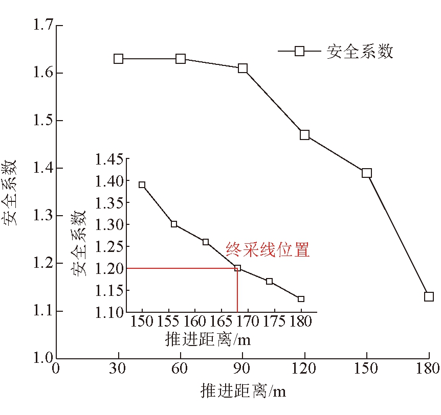图6 4号煤层工作面推进过程中最大剪应变云图 由图6可知,当推进距离由0增至90 m时,边坡主要受坡体自身变形影响,形成圆弧形滑移面,该滑移面从排弃物料延伸至坡底的黄土层。当工作面推进距离大于120 m时,井工开采影响导致潜在滑面转移,井工开采工作面覆岩上方剪应变开始逐步发育,并逐步贯通至坡体表面,工作面两端各形成一个潜在滑移面,边坡稳定性大大降低。 3.3 安全系数及终采线位置4号煤层推进过程中安全系数及终采线位置如图7所示。 由图7可知,边坡安全系数随着工作面推进距离的增加呈现先缓慢减小后快速减小的变化规律,推进距离由30 m增至90 m,该阶段边坡安全系数受采动影响较小,安全系数由1.63降至1.61,降幅仅为1.23%;推进距离由90 m增至180 m,安全系数由1.61降至1.13,降幅为29.81%,这表明采动对边坡安全具有显著影响。为满足边坡安全系数大于1.2的要求,4号煤层工作面推进距离最大为168 m,即距离1 260平盘坡顶线右侧的水平距离为98 m。