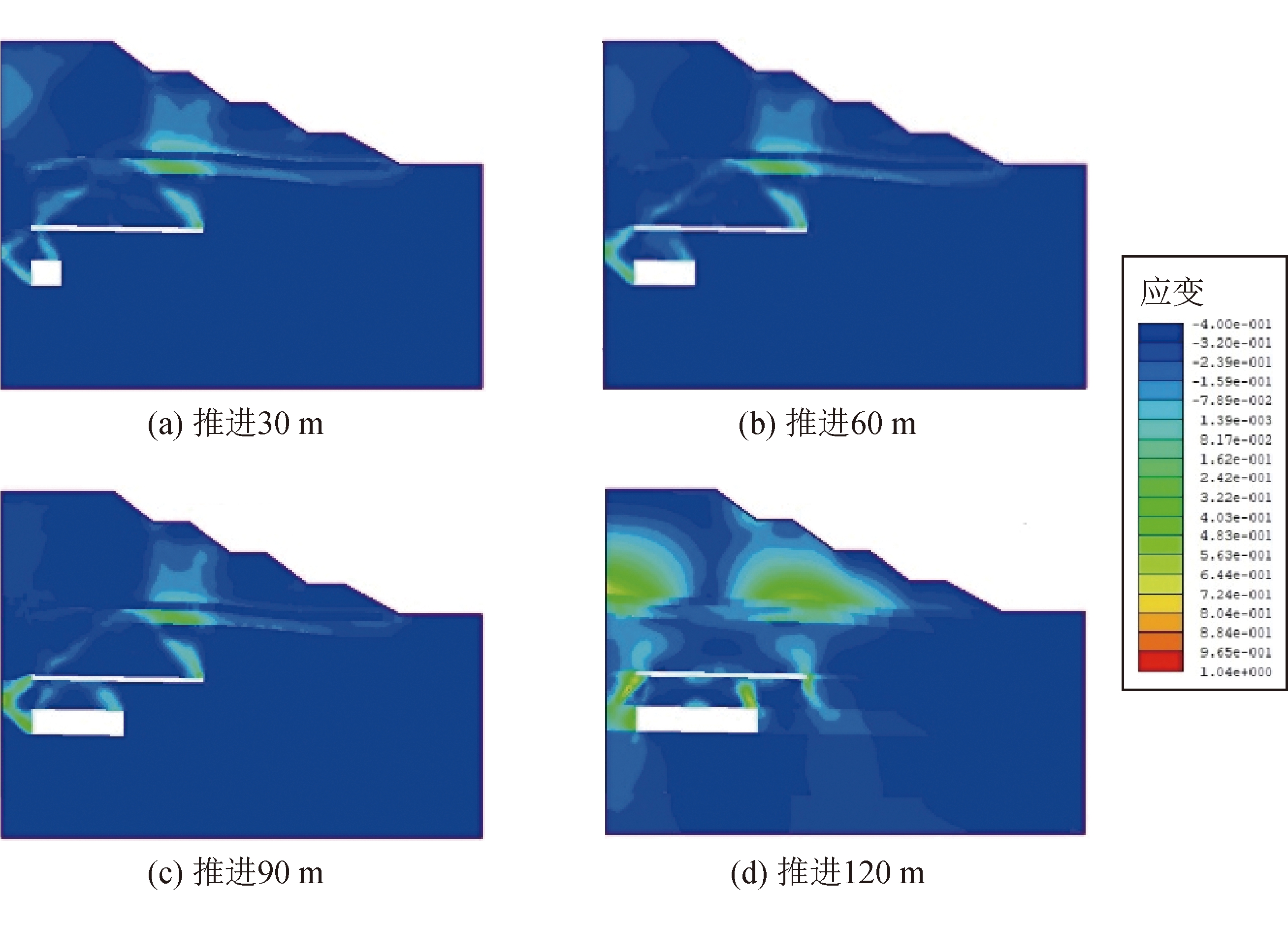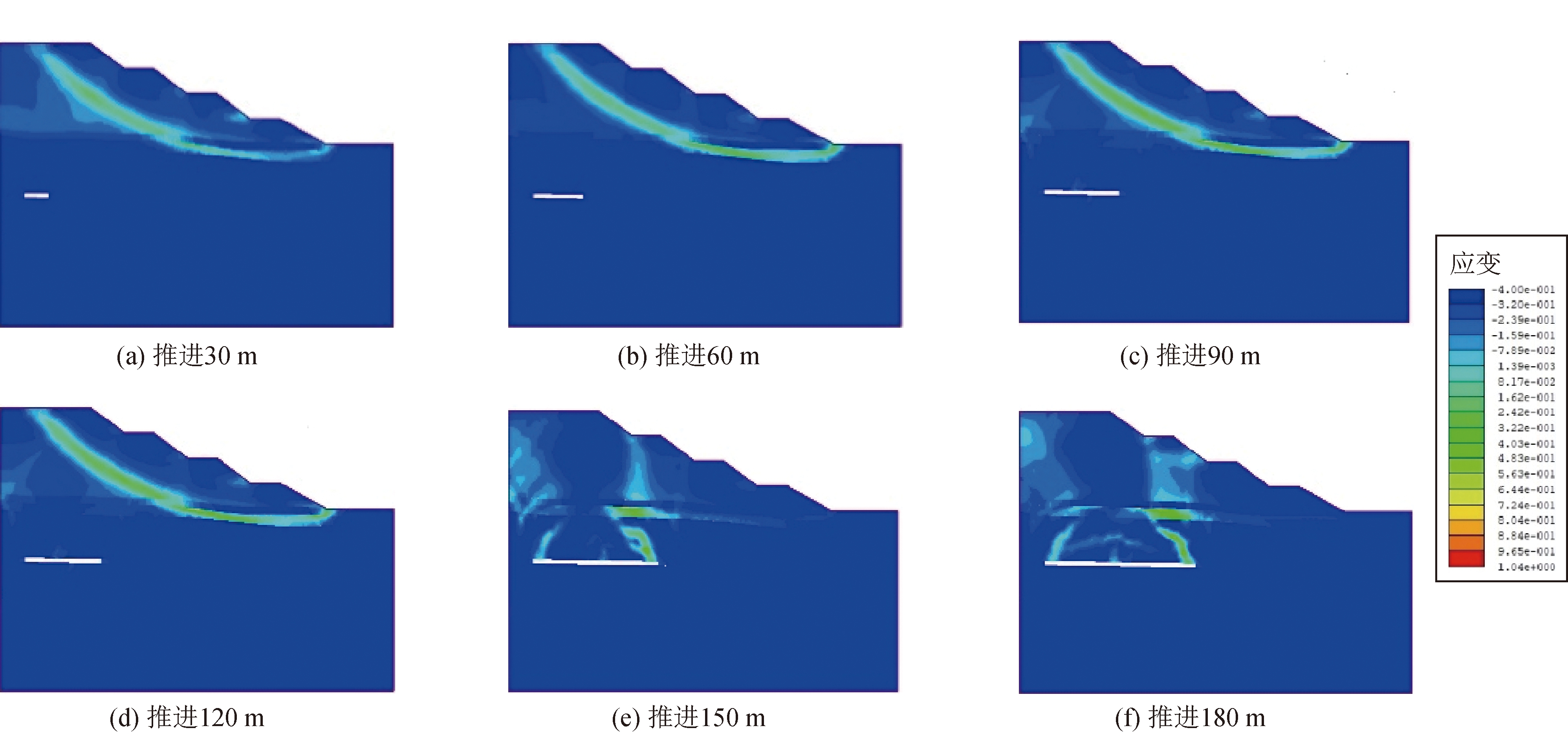 图5 4号煤层工作面不同推进距离下各监测点水平位移和垂直位移变化曲线 (1)当推进距离小于90 m时,边坡表面水平位移和垂直位移主要受坡体变形的影响,受采动影响较小,边坡水平位移等值线呈“圆弧形”,边坡垂直位移主要集中在边坡坡顶;当推进距离超过90 m时,采动对边坡位移的影响逐渐趋于明显。工作面顶板上方出现向左移动的水平位移,垂直位移主要集中在工作面顶板上方覆岩内;当工作面继续向前推进到150 m后,边坡最大水平位移和垂直位移趋于稳定。随着4号煤层工作面的继续推进,边坡最大水平位移的位置从剖面内部不断向坡顶位置转移,井工开采沉陷产生的下沉值贯穿到地表,工作面中部沉陷值最大,自工作面中部向两侧垂直位移值逐渐减小。 (2)当工作面由30 m推进至120 m,3坡面以上各监测点水平位移呈现逐渐增大的变化趋势;随着工作面继续推进,1 200平盘、2坡面和3坡面最大水平位移值呈现出先增大后减小的趋势,前期由于坡体变形使得水平位移值不断增大,当推进到120 m时,受到井工开采沉陷的影响,坡体开始向采空区一侧移动,使得水平位移开始减小;整体来看,随着工作面的不断推进,工作面的最大水平位移呈现出先增大后趋于稳定的变化规律,当推进距离从30 m增加到180 m时,边坡的最大水平位移由0.04 m增加到1.04 m。 (3)随着推进距离不断增大,3坡面以上各测点垂直位移不断增大,3坡面以下各台阶边坡位移近似为零;边坡最大垂直位移随着工作面推进距离的增加呈现逐渐增大的变化趋势,待采动影响贯通地表后,最大垂直位移值趋于稳定。4号煤层工作面推进距离由30 m增至180 m,工作面最大垂直位移由0.18 m增加到4.65 m。 3.2 最大剪应变变化特征4号煤层工作面推进过程中最大剪应变云图如图6所示。