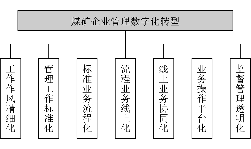 ★ 经济管理 ★ 煤矿企业管理数字化转型研究1 煤矿企业管理数字化转型研究的必要性和意义1.1 响应国家产业升级的战略需要习近平总书记多次对推动数字经济和实体经济融合发展工作作出重要指示,《中共中央关于制定国民经济和社会发展第十四个五年规划和二〇三五年远景目标的建议》明确指出,“十四五”期间要加快数字化发展,推进数字产业化和产业数字化。数字化建设是国家转变发展方式、实现高质量发展的核心驱动力,是培育发展新动能的重要手段,工业经济时代的产业运行体系正发生根本性变革,资源配置、协作创新、生产组织、生产运营等方式加快转变,全球经济正迈入体系重构、动力变革、方式转变的新阶段。 数字化已经在方法和工具层面重构管理学[1],应用网络化、数字化、智能化推动产业管理、组织结构、管理方法的现代化,从而促进传统产业快速升级发展。 1.2 煤矿企业提效升级的现实需要煤炭行业是传统行业,一定程度上存在管理理念落后、管理手段滞后、人员素质低、管理水平不高等问题;主要表现为工作作风简单粗放、时间观念差、部门之间配合低效、现代管理工具应用少、效率低(人均产煤量低)等现象。如何准确把握数字化发展给企业管理工作带来的新机遇,并在此基础上不断完善企业的管理机制,不断提高整体管理能力和水平,需要一场从理念到机制的深刻变革。 煤矿数字化建设代表着煤炭先进生产力的发展方向,是行业迈向更高质量发展的必由之路和强大动力,加快推进煤炭行业网络化、数字化建设,能全方位迎接行业面临的管理升级带来的机遇和挑战。推动数字化转型,用数字化重新定义生产、销售、管理,推动行业发展[2],不仅符合国家倡导的方向,也顺应行业发展需求,但煤矿企业如何实现数字化转型需要进一步分析研究解决。 2 煤矿企业管理、数字化转型的现状2.1 煤矿企业对信息化、数字化重视程度逐步提升部分煤矿企业已认识到在数字经济的发展背景下,煤炭数字产业潜力巨大,可适时整合优势资源,将信息技术、数字经济作为企业未来发展的潜力板块。越来越多的煤矿企业希望通过信息化、数字化、智能化建设,提升企业核心竞争力。各大煤炭集团在此方面的投入不断加大,重视程度不断提升。然而,部分煤矿企业高层领导缺乏对两化融合、数字化转型的深刻理解,或将关注点仅放到煤矿智能化建设一个领域,把智能矿山等同于数字化转型;或认为实施一些大的信息化项目和一些大的系统就实现了数字化转型。认识上依然存在偏差。 2.2 煤矿管理工作需要进行管理方式的变革目前多数煤矿管理工作依然靠“五动一奖”(开会、安排、检查、评比、竞赛,奖金)推动,没有形成流程化、制度化、数字化机制。一是存在封闭、推诿、扯皮、办事拖拉、效率低、理念落后、业务部门流动与协同性差问题;二是存在做事不细致、资源配置不科学、整体运行效率低、流程周期长、运行费用高、手段相对落后、经验不便积累等问题。这一切都需要进行管理方式的变革,加快数字化转型,促进企业增质提效。但据调研,多数煤矿数字化建设只完成办公自动化(OA)系统,销售、物资管理领域部分实现了信息化,但大量业务(财务报销、措施审批、会议记录等等)还未进行数字化转型,依然采用纸质记录、人工流转,存在效率低、不闭环等问题。 煤矿企业管理现状和数字化的优势表明,需要用数字化转型倒逼管理变革,管理变革需要数字化支撑和提升[3],在数字化转型中进行管理变革,在变革中实现数字化转型,相互融合,双轮驱动,以管理变革提升数字化转型质量和效果。 3 煤矿企业管理数字化转型特征分析“数字”的本意表示数目的符号,“化”是转化(微观),是一个过程,是一场运动(宏观)。数字化是将许多复杂多变的信息转变为一系列计算机可以进行统一处理的二进制代码,是业务的数字转化和表达,是业务的计算机化、网络化,是生成数据、管理数据、利用数据。“管理”是管人和理事,“转型”就是变革。管理数字化转型,是在数字化转换、升级基础上企业管理的系统变革,是生产要素优化、流程再造的过程,是以构建新型管理模式为目标的高层次变革。管理数字化转型[4],不仅仅是单一信息化,而是包括对企业业务(活动、流程、业务模式等方面)进行系统性重新定义,全方位、多维度的突破和升级,实现一切业务在线,数据驱动业务。 以企业管理高效为目标,升维思考、降维理事,从业务和技术两层面理解数字化转型。以数字化转型为统领,融合现代管理方法和现代信息化手段,双要素驱动,在数字化转型过程中实现管理变革,在管理变革中实现数字化转型,相互促进;在专业化、精细化、标准化支持下,实现数字化协同管理,划清边界,控制节点,顺畅流程,协作协同,解决企业管理长期以来部门边界不清、任务节点控制难、各自为战、流程不畅等问题,达到管理的最佳工作状态、最佳工作方法、最高工作效率。 企业数字化转型的根本任务是价值体系的系统优化、创新和重构,关键是管理人员思想的转型,要学习提升。管理数字化转型也是一个去中心化、多元化的权责生态系统,每个员工都有更多平等参与的机会,是一个优于传统的单向化、集中化、侧重控制的相对封闭式管理。 4 煤矿企业管理数字化转型策略遵循企业数字化转
