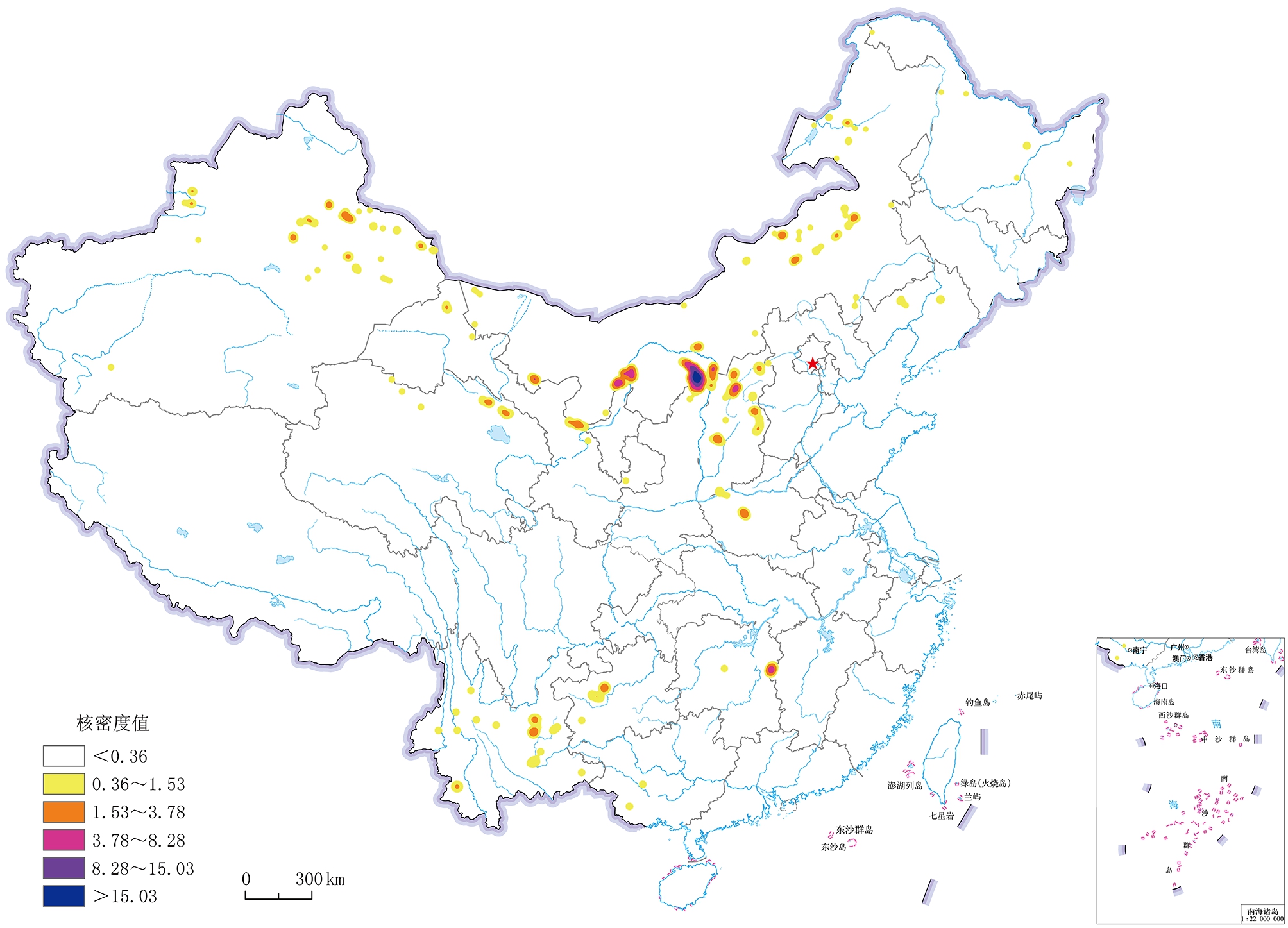 图2 我国省(区)露天煤矿数量分布 通过计算得到我国露天煤矿地理集中指数为48.16。假设519座露天煤矿平均分布在我国34个省(区),即每个省的露天煤矿数量为15.26座,通过计算得出地理集中指数为17.15,即均匀分布状态下的露天煤矿地理集中指数小于实际露天煤矿地理集中指数,可知我国露天煤矿在各省(区)的空间分布不均衡,具体分析如下。 (1)从省(区)角度分析,露天煤矿分布主要集中在内蒙古、新疆、陕西、山西、云南5个省(区),其露天煤矿总数量约占全国露天煤矿总数量的83.82%。 (2)从地理方位角度分析,我国露天煤矿主要分布在北方,且多聚集在西北和华北地区,北方地区露天煤矿总数量约占全国的86.42%。 (3)从依据其经济发展水平划分的东中西部角度分析,我国露天煤矿主要分布在煤炭资源丰富但经济发展较慢的中部和西部地区,经济发展较快的东部沿海省份基本没有露天煤矿,中西部地区露天煤矿总数量约占全国的98.43%。 (4)从露天煤矿的运营状态角度分析,目前闭坑的露天煤矿绝大多数是中小型露天煤矿,而在建的露天煤矿基本都是大型及以上规模的露天煤矿。 (5)从不同开采露天煤矿规模角度分析,产能在20 Mt/a及其以上的开采特大型露天煤矿有6座位于内蒙古自治区,3座位于山西省,数量占全国的2.39%,产能占全国的25.68%;产能在大于等于4 Mt/a且小于20 Mt/a的开采大型露天煤矿共有44座,开采大型和特大型露天煤矿总数量虽只占全国的14.1%,但其总产能却占全国露天煤矿总产能的67.05%。 综合上述分析结果可知,我国露天煤矿的空间分布极不均衡,从总体上看表现出北密南稀、西中部多而东部少且主要集中于内蒙古、山西等5个省(区)的空间分布特征。 2.3 我国露天煤矿空间分布集聚特征为了全面了解我国露天煤矿分布的连续变化和精确集聚中心,利用ArcGIS软件中核密度工具生成的我国主要露天煤矿核密度分布如图3所示。由图3可以看出,我国露天煤矿核密度值在不同地区呈现明显的差异,进一步分析如下。