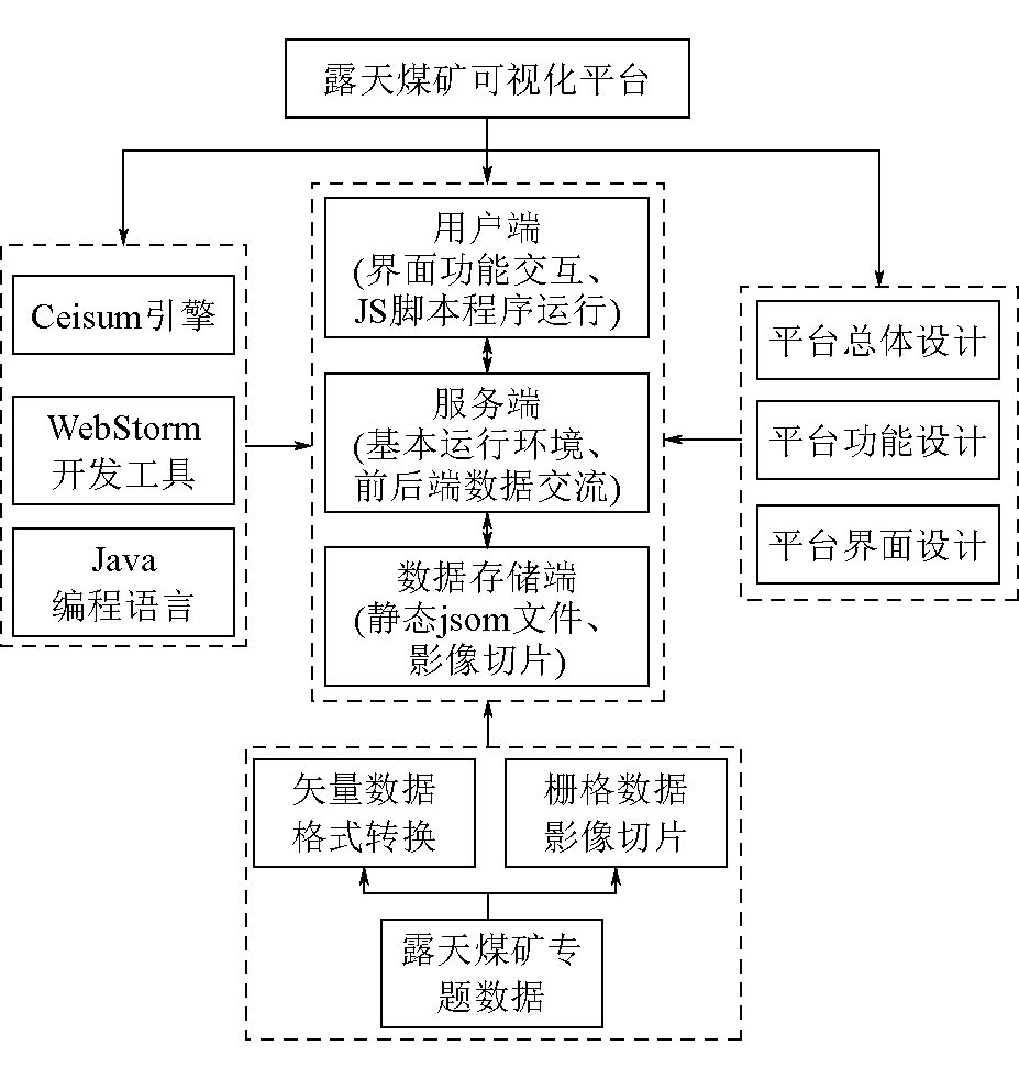 图3 我国主要露天煤矿核密度分布 (1)山西省露天煤矿分布在空间上形成了1个高密度区、4个次级高密度区,且主要分在晋中和晋北地区。高密度区主要位于忻州市宁武原平矿区,次级高密度区则位于大同市的浑源矿区、朔州市的平朔矿区、阳泉市的盂县昔阳和顺矿区、横跨晋中吕梁两市的交口灵石矿区。 (2)内蒙古自治区作为我国的煤炭资源大省,在空间上形成了一个全国最高密度区、多个高密度区和多个次高级密度区。全国最高密度区是我国最大且横跨陕晋蒙的鄂尔多斯露天煤田。其它集聚区则主要分布于呼伦贝尔市的扎赉诺尔矿区、宝日希勒矿区、大雁矿区和伊敏矿区,锡林郭勒盟的贺斯格乌拉矿区、农乃庙矿区、白音华矿区、吉林郭勒矿区、胜利矿区、玛尼图矿区和白音乌拉矿区,通辽市的霍林河矿区,包头市的大青山石拐矿区,鄂尔多斯市的准格尔矿区和神东矿区,乌海市的乌海矿区,阿拉善盟温都尔勒图镇矿区和西大窑唐家沟地区。 (3)新疆维吾尔自治区作为我国西部煤炭资源勘探与开发的重点地区,目前已经形成了多个煤炭露天开采集聚区。目前新疆绝大多数露天煤矿主要分布在新疆的北部,具体有伊犁伊宁矿区、五彩湾矿区、将军庙矿区、大井矿区、西黑山矿区、老君庙矿区、北塔山矿区、巴里坤矿区、三塘湖矿区、淖毛湖矿区等诸多国家规划矿区。 (4)云南省露天煤矿分布主要形成了3个集聚区,分别是先锋宜良矿区、小龙潭矿区和跨竹矿区,其他露天煤矿则零星分布在云南省各地。 (5)从全国整体上看,我国露天煤矿分布形成了鄂尔多斯露天煤田唯一大规模高密度聚集区和以国家矿区和地方矿区为主的多个小规模高密度聚集区,聚集区域呈现“开发显著集中,大型露天煤田独占鳌头,国家规划矿区和地方矿区并存”的空间分布格局。 3 露天煤矿可视化平台设计3.1 框架设计随着GIS的发展,其作为高效、集成、可视化的空间信息表达和空间分析平台,当前正走向完全Web化,涌现了以Cesium为首的开源引擎利用Web端技术开发的地理信息平台,大大提高了平台的开放程度[21]。本平台的设计目标主要是开发一套用于露天煤矿专题数据展示的WebGIS平台,其架构设计如图4所示。