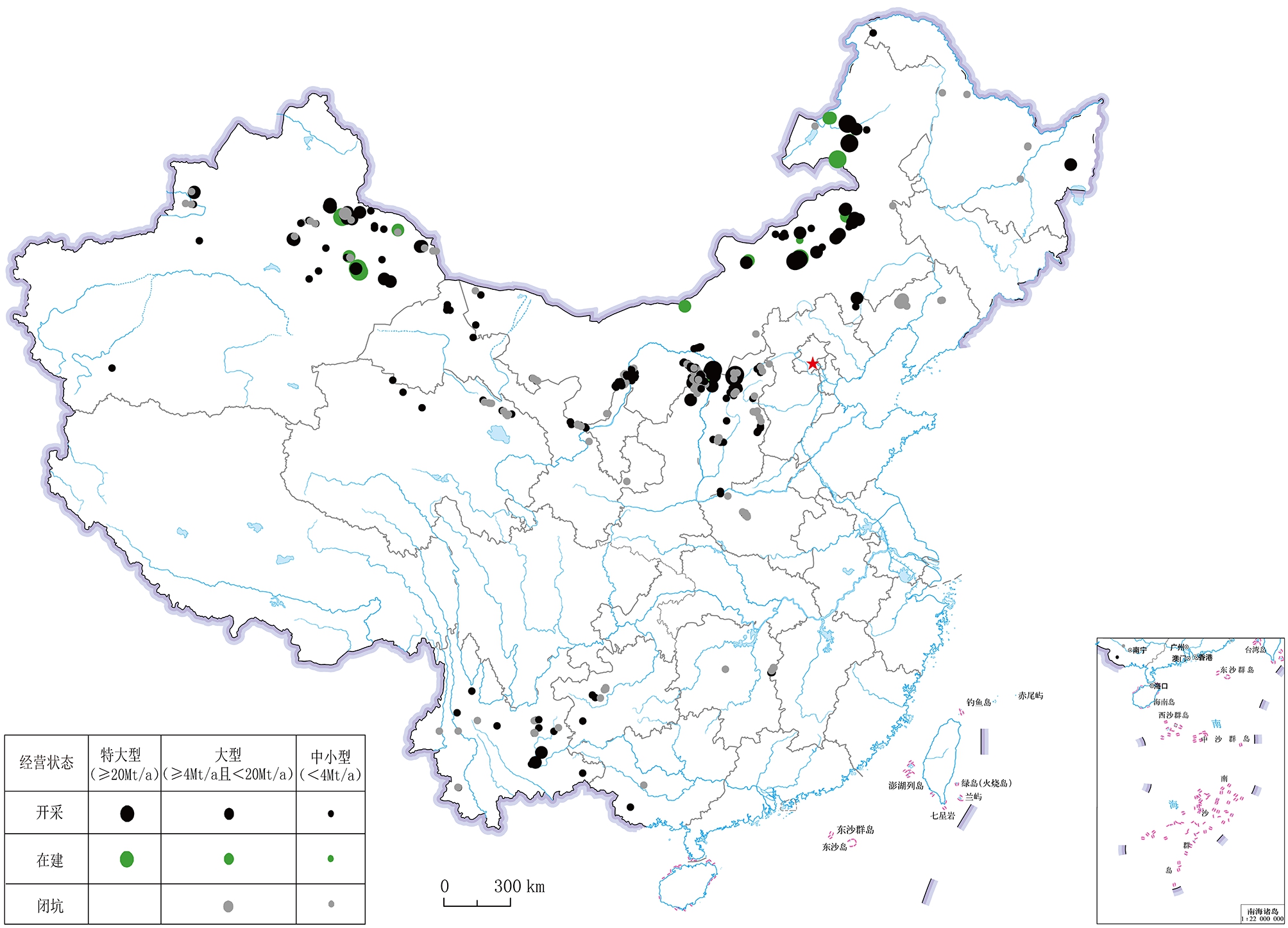★ 生产开发 ★ 我国露天煤矿空间分布特征分析及可视化平台构建露天开采是煤炭开采的一种主要生产方式,具有单井规模大、效率高、集约性强、事故率低等显著优势。截止2020年底,我国共有露天煤矿376处,总产能9.5亿t/a,占全部生产煤矿产能比由1980年的2.7%增至2020年的17.8%[1-4] 。露天煤矿的高质量发展对促进我国煤炭资源的高效科学合理开采、绿色矿山建设等方面具有现实意义。 近年来国内学者对露天煤矿展开了大量研究,主要集中在采矿理论、开采工艺与设备、绿色矿山建设、发展现状等方面,虽大多数研究[5-10]都提到我国露天煤矿分布情况,但更多是提及国家大型规划矿区、大型企业投资建设的大型或特大型露天煤矿,很少涉及地方矿区、中小型企业建设的中小型露天煤矿,且研究程度较浅。然而,我国中小型露天煤矿数量远远多于大型、特大型露天煤矿的数量,且分布和开发情况颇为复杂。 空间分布特征作为空间分析的重要内容,近年来已有诸多学者对其展开了深入的研究。从已有研究成果看,最近邻指数、地理集中指数、核密度估计等点模式分析方法已被广泛的运用到空间点数据分布特征研究,如居民点[11-12]、旅游景点[13-14]、传统村落[15-16]等,但很少对露天煤矿空间分布特征进行研究。相比美国能源信息署的煤炭数据浏览器、澳大利亚地球科学局的澳大利亚矿山图集、印尼能源和矿产资源部的一张图等,都能良好地展示该国境内煤矿的分布情况,目前我国尚未拥有从宏观尺度构建的国家级、开放、共享、面向公众聚焦于露天煤矿分布的地理信息平台,不仅阻碍了公众对我国露天煤炭资源分布的认识,还给科研工作者统计相关数据带来不便。基于此,利用GIS了解和研究我国露天煤矿空间分布特征,总结归纳露天煤矿开发布局十分必要。 1 数据来源与研究方法1.1 数据来源露天煤矿数据来源主要有3个方面,一是从国家能源局和各省政府相关煤炭部门获取的证照齐全依法合规的露天煤矿;二是从虚拟地球历史影像资料搜集露天煤矿,煤矿露天开采占用和破坏土地的规模较大,与周围的地物存在明显差别,在遥感影像上的特征较为明显,矿区盘旋的运输道路、大型的边坡、活动采区、排土场等矿山地物均易于识别,通过目视虚拟地球历史影像资料并依据专家经验判读是搜寻露天煤矿并确定其经营状态的重要途径;三是从国内专著、论文、期刊等入手,辅以搜索引擎、贴吧、博客、新闻等渠道,主要获取对应露天煤矿的详细信息。 综合以上3个方面的数据来源,搜集露天煤矿的包括开发主体、行政区划、经纬度坐标、矿区概况等在内的相关信息,之后制定规范并编制成文档,最后将其空间可视化为矢量数据。笔者一共搜集了我国从2000-2020年内出现的519处露天煤矿(包括生产、在建、闭坑3种经营状态的露天煤矿,其中生产露天煤矿是指截至2020年底之前处于正常运营状态的露天煤矿,在建露天煤矿是指截至2020年底之前已核准开工建设未投产或暂定开发主体的新建露天煤矿,闭坑露天煤矿是指截至2020年底已经停产多年或闭坑且在遥感影像上有明显的历史遗留特征的露天煤矿)。我国主要露天煤矿地理空间分布如图1所示。