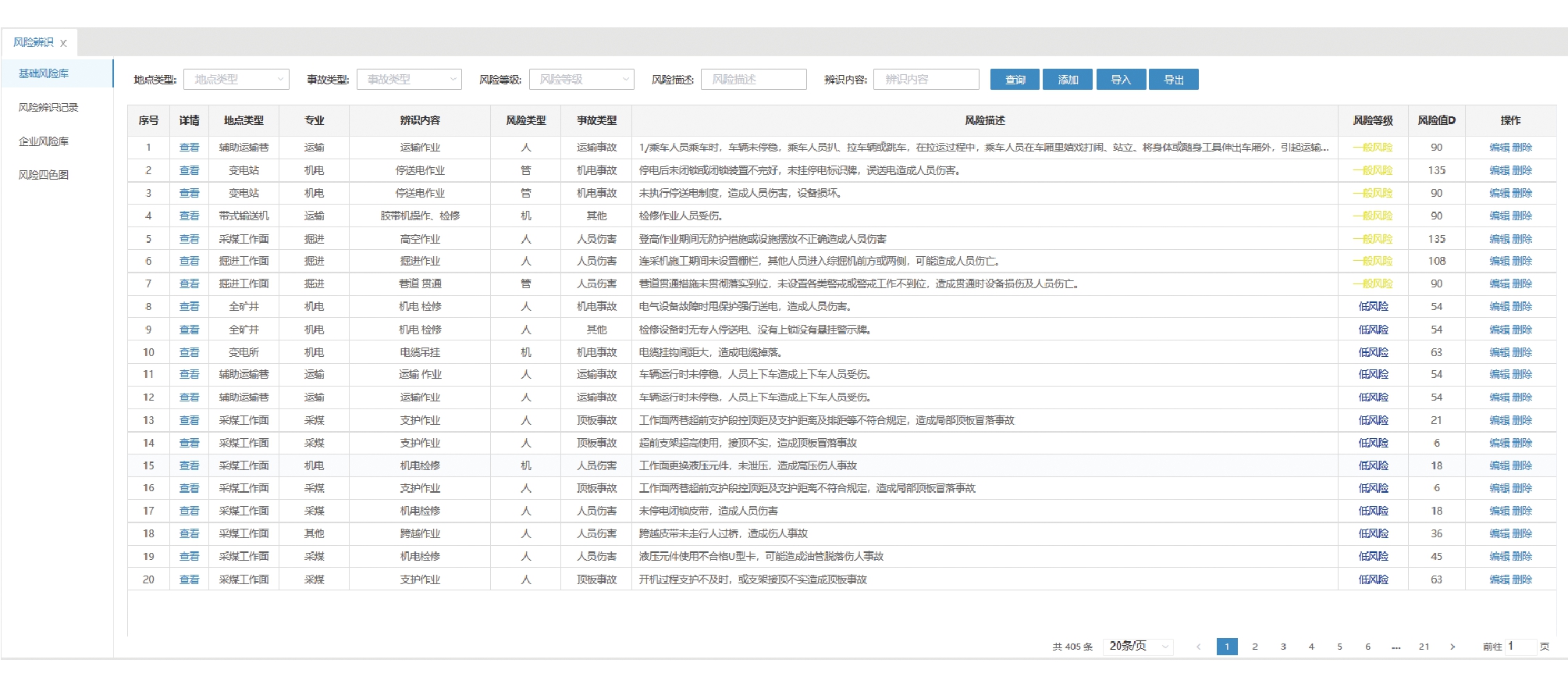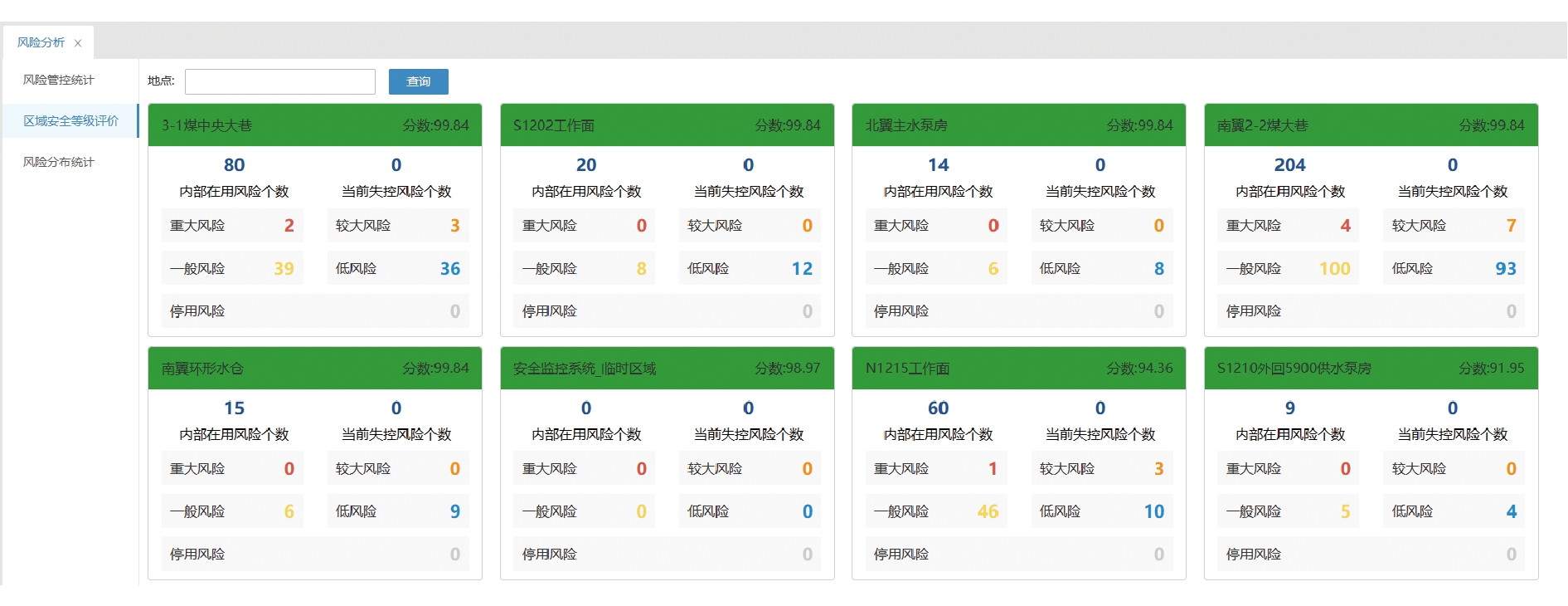 图4 安全态势预测预警界面 2.3 安全风险分级管控系统结合煤矿的实际生产情况,实现对安全风险的记录、跟踪、统计、分析、上报的全过程管控。主要功能包括:基础数据库、风险辨识结果录入、风险管控措施落实、风险管控措施落实检查、风险动态监视、风险警示告知、安全风险分布四色图、风险分析、风险上报等。安全风险分级管控界面如图5所示。