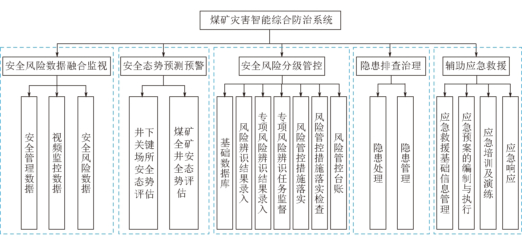 图1 煤矿灾害智能综合防治系统架构设计 通过传感器、摄像头、智能终端等监测手段对与煤矿灾害相关的数据进行监视上传,如与粉尘相关的粉尘浓度等,以及与火灾相关的采空区温度、气体浓度等,然后利用自回归深度学习模型、多层RNN-LSTM模型、LSTM-ARIMA学习模型等对获取的庞大数据进行存储、分析等加工处理,并将监测数据与生产数据匹配,实现煤矿井下各种灾害的分析预测,最后将各种灾害子系统统一到综合防治系统。 2 煤矿灾害智能综合防治系统主要功能根据煤矿灾害智能综合防治系统设计思路,煤矿灾害智能综合防治系统实现的主要功能包括安全风险数据融合监视、安全态势预测预警、安全风险分级管控、隐患排查治理、辅助应急救援等。煤矿灾害智能综合防治系统功能架构如图2所示。