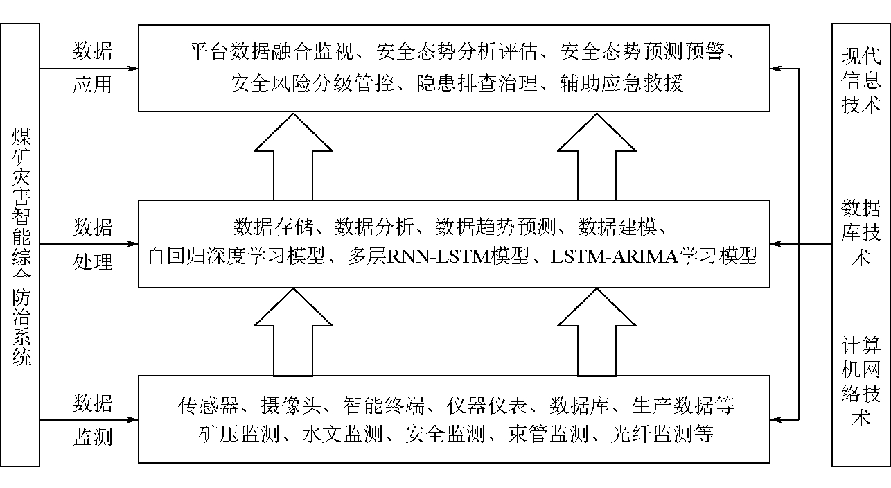 图8 灾害监测数据评价模型处理流程 3.3 灾害响应与辅助救援技术按照事故类型在系统中对各灾害安全等级进行划分,设定灾害预案响应的启动条件。安全等级可划分为安全区间、关注区间和警示区间,根据风险评价等级测度值判断灾害等级区间,若评价等级测度值在警示区间或达到设定灾害响应启动条件,灾害综合防治系统会发出警报,并对相关人员发送消息提醒。同时国家突发事件应急体系建设“十四五”规划中明确指出,提升应急平台支撑能力,推进“互联网”在应急平台中的应用,加强应急指挥平台等专业应急平台建设,提高突发事件专业信息汇集、应急决策和指挥调度能力[20]。煤矿发生突发灾害事故后,需要监管监察部门、相关专家到现场指挥救援,可借助网络通讯技术、信息共享技术、远程控制技术等实现异地协同协作,保障相关专家第一时间了解现场情况,方便现场指挥。 监管监察部门、相关专家到现场后,在应急救援资源基础信息管理系统线上调取救援需要的技术资料,了解应急设备和物资的分布情况,帮助监管监察部门、相关专家指挥救援。同时可辅助应急救援管理系统根据事故发生地点和类型,采用路径寻优算法演算井下工作人员到安全位置的最优路径,实现智能辅助救援。 4 应用情况2022年8月,煤矿灾害智能综合防治系统在陕煤集团神木柠条塔矿业有限公司进行了现场应用,全面提高了该矿安全生产的预控、可控和在控能力。 (1)系统实现煤矿安全风险数据融合监视、煤矿安全态势预测预警、安全风险分级管控、隐患排查治理和辅助应急救援等灾害智能综合防治系统的主要功能,建立的统一数据中心能够在统一时空框架下实现“人-机-环-管”系统协同管理。 (2)实现煤矿粉尘、火灾、水害等灾害的统一管理。系统采取多个责任部门、责任人与责任领导共同参与业务制定和流程审批的线上协同办公机制,对各业务处理流程的实时状态采取公开透明的监督办法,使得在业务下发以及措施计划等编制审批环节能够进行相互监督和检查,提高了业务处理效率,减少了少查、漏查、不查等现象。 (3)对日常的业务处理过程留痕,将处理结果自动归档并进行分类整理和储存,使得对日常资料的管理更加规范,减少了漏资料、丢资料的现象,对事故隐患、风险管控的日常业务数据进行统计分析,并绘制了相关的趋势图和饼图,使矿领导可以直观、全面地了解实时的煤矿安全管理情况以及个人的工作情况。 5 结语煤矿灾害智能综合防治系统建设了以煤矿风险为核心,围绕风险辨识-措施落实-风险监视-评估预警及异常处置的风险状态变化链,研发了基于智能矿山总体框架下的安全保障综合防控应用中心,包括安全风险数据融合监视、安全态势预测预警、安全风险分级管控、隐患排查治理、辅助应急救援等应用模块,利用自回归深度学习模型、静态多层RNN-LSTM深度学习模型,融合网格化区域内的水害、火灾、环境、矿压、粉尘及重大风险、隐患数据,进行单一传感监测数据及区域网格安全指数评价,并推演出全矿的安全指数,从而实现了全方位、有效落地的安全风险防控机制,为煤矿智能化生产提供了有利保障。 [1] 任怀伟,孟祥军,李政,等.8 m大采高综采工作面智能控制系统关键技术研究[J].煤炭科学技术,2017,45(11):37-44. [2] 王国法,张德生.煤炭智能化综采技术创新实践与发展展望[J].中国矿业大学学报,2018,47(3):459-467. [3] 孙继平,程加敏.煤矿智能化信息综合承载网[J].工矿自动化,2022,48(3):1-4,90. [4] 张帅,任怀伟,韩安,等.复杂条件工作面智能化开采关键技术及发展趋势[J].工矿自动化,2022,48(3):16-25. [5] 王国法,赵国瑞,任怀伟.智慧煤矿与智能化开采关键核心技术分析[J].煤炭学报,2019,44(1):34-41. [6] 李首滨.智能化开采研究进展与发展趋势[J].煤炭科学技术,2019,47(10):102-110. [7] 王国法,刘峰,孟祥军,等.煤矿智能化(初级阶段)研究与实践[J].煤炭科学技术,2019,47(8):1-36. [8] 黄乐亭,黄曾华,张科学.大采高综采智能化工作面开采关键技术研究[J].煤矿开采,2016,21(1):1-6. [9] 邓涛,王思栋,杜兆文,等.薄煤层综采远程可视化无人工作面开采技术[J].煤矿安全,2019,50(6):91-93. [10] 于健浩,祝凌甫,徐刚.煤矿智能综采工作面安全高效开采适应性评价[J].煤炭科学技术,2019,47(3):60-65. [11] 王国法.煤矿智能化最新技术进展与问题探讨[J].煤炭科学技术,2022,50(1):1-27. [12] 孟秀峰,李靖,赵洪亮.矿井瓦斯防治系统快速诊断评价方法研究[J].煤炭工程,2018,50(4):100-104. [13] 蒲阳,宁小亮.煤与瓦斯突出防治信息化管理系统构建[J].矿业安全与环保,2020,47(3):45-48. [14] 卢瑞翔,苏贺涛,康宁,等.基于专家决策支持的煤自燃火灾防控系统设计[J].武汉理工大学学报(信息与管理工程版),2020,42(5):403-408. [15] 陈晓晶.基于“云-边-端”协同的煤矿火灾智能化防控建设思路探讨[J/OL].煤炭科学技术. https://doi.org/10.13199/j.cnki.cst.2021-0488. [16] 郑林江,周龙辉,王杰,等.基于物联网的煤矿粉尘监测云服务平台设计[J].煤炭科学技术,2019,47(7):164-170. [17] 王皓,董书宁,姬亚东,等.煤矿水害智能化防控平台架构及关键技术[J].煤炭学报,2022,47(2):883-892. [18] 屈世甲,武福生.煤矿智能工作面环境安全监测及预警方法研究[J].煤矿安全,2020,51(8):132-135. [19] 孙继平.煤矿信息化与智能化要求与关键技术[J].煤炭科学技术,2014,42(9):22-25,71. [20] 武强,徐华,赵颖旺,等.