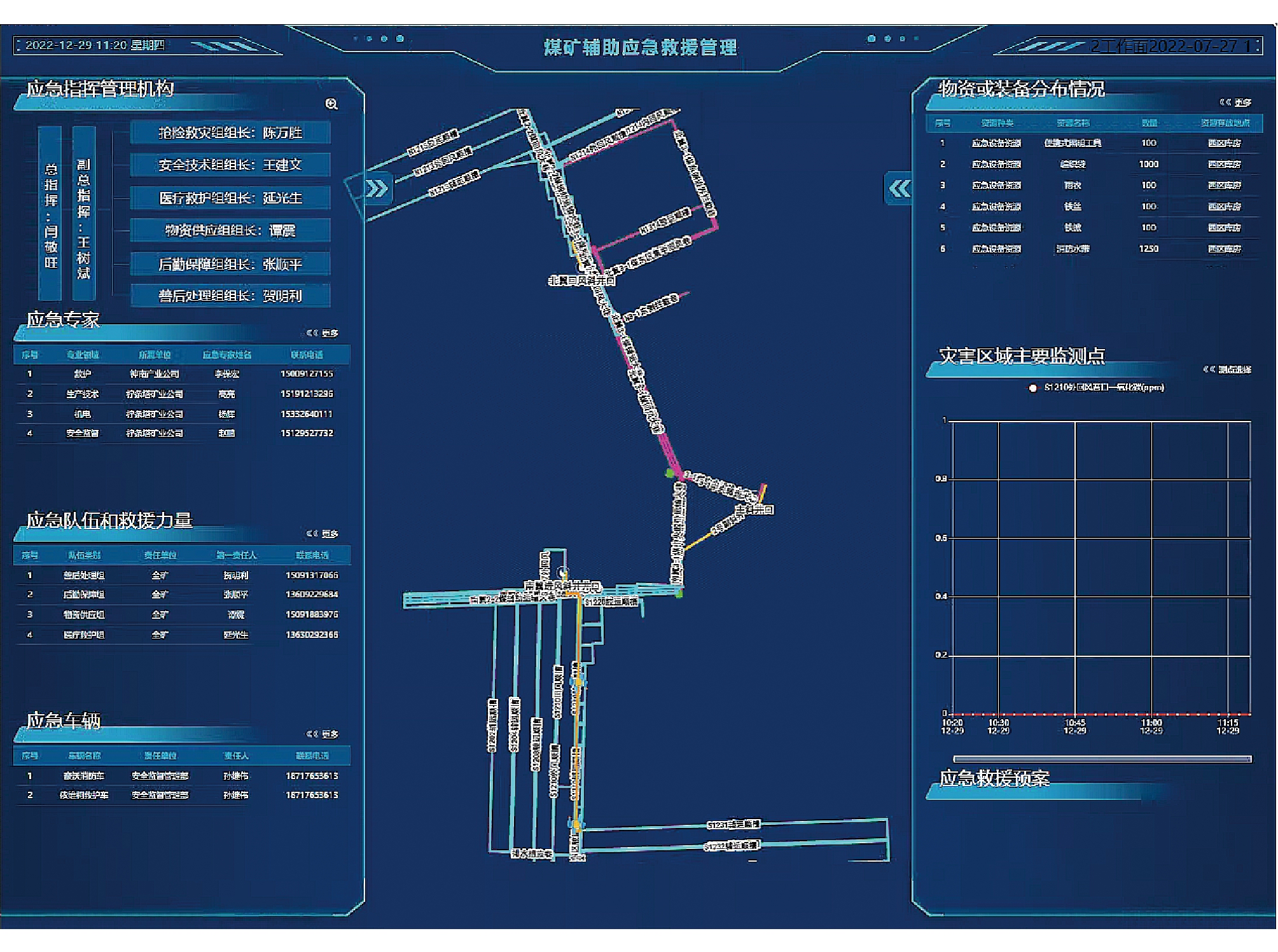 图6 隐患排查统计分析界面 2.5 辅助应急救援根据综合/专项应急预案管理及处理流程,并依据重大事故分类危害程度的级别设置应急救援组织机构及应急指挥保障、应急预案体系、组成人员、联系方式,明确职责划分。同时根据事故类别及事故级别,基于预设的报警、接警、通知、通讯联络方式,依据事故的类别、危害程度的级别对可能发生的事故现场情况进行分析,设定预案分级响应的启动条件,发送相关人员职责,相关的注意事项、事故处置要点,实现分级响应,分级消息提醒,避灾线路查询、应急响应组织查询、就近救援物资分布。辅助应急救援管理界面如图7所示。
