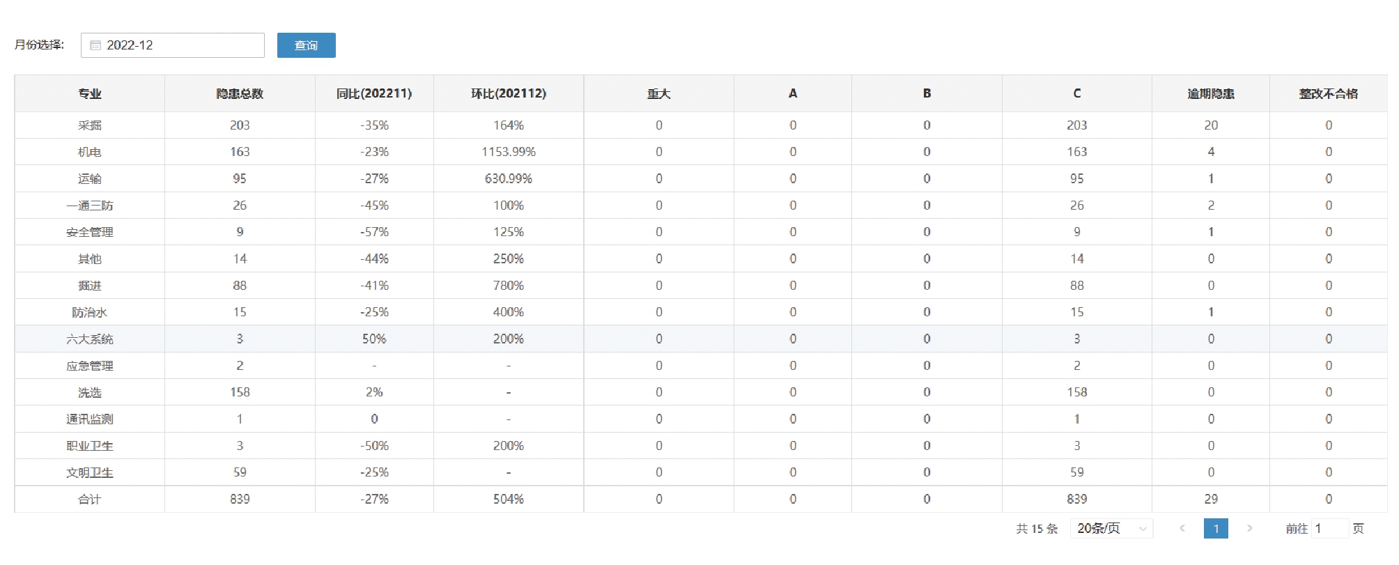 图5 安全风险分级管控界面 2.4 隐患排查治理采用信息化管理手段,构建标准化的隐患闭环治理流程,实现从隐患登记、落实、整改确认、复查验收、销号的全过程信息化闭环管理,根据煤矿安全管理组织架构及管理制度,实现对隐患流程各节点人员的灵活配置。同时,利用信息技术实现隐患信息的快速传递以及规范化的隐患处理流程,提高存在隐患相关单位以及业务科室的协同处理能力,加快隐患处理速度,确保隐患整治期间的及时、有效控制,避免隐患整治期间可能出现的安全风险。隐患排查统计分析界面如图6所示。