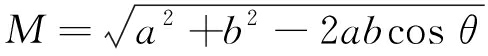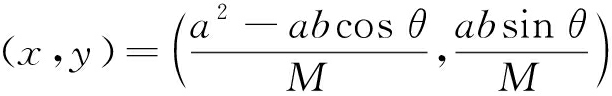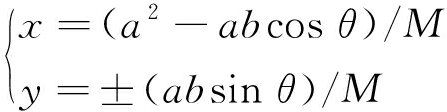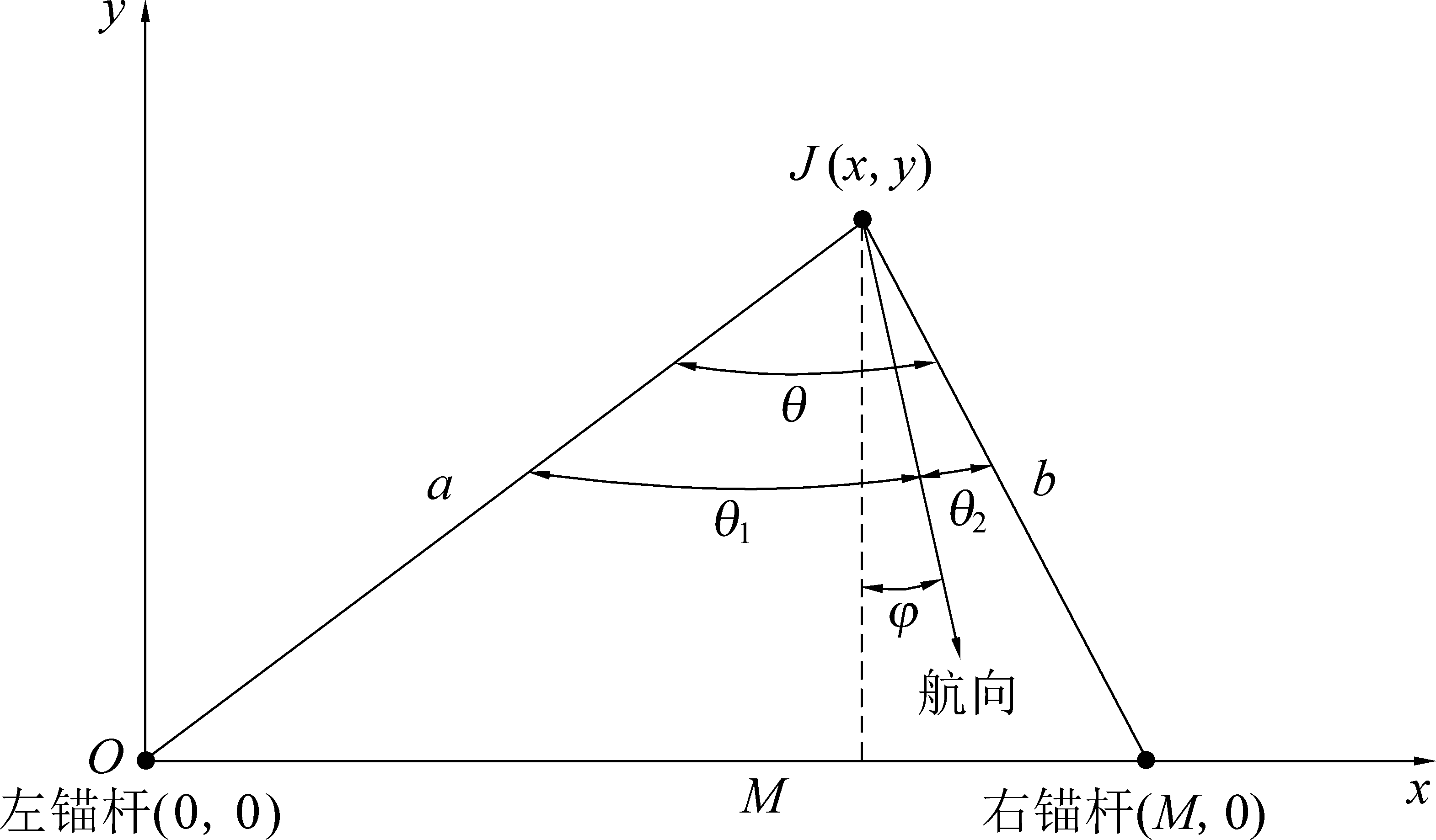 图7 钻锚机器人后移位姿示意 钻锚机器人后移定位模型如图8所示,在二维坐标系内,J点为激光雷达所在位置,坐标为x,y,箭头指向为钻锚机器人航向,锚杆之间距离为M,激光雷达采集到左锚杆距离水平投影为a,到右锚杆距离水平投影为b,a、b之间夹角为θ,航向与左锚杆之间的扫描夹角为θ1,与右锚杆之间的扫描夹角为θ2,偏航夹角为φ。