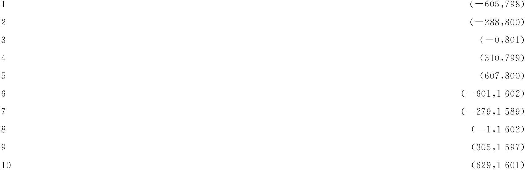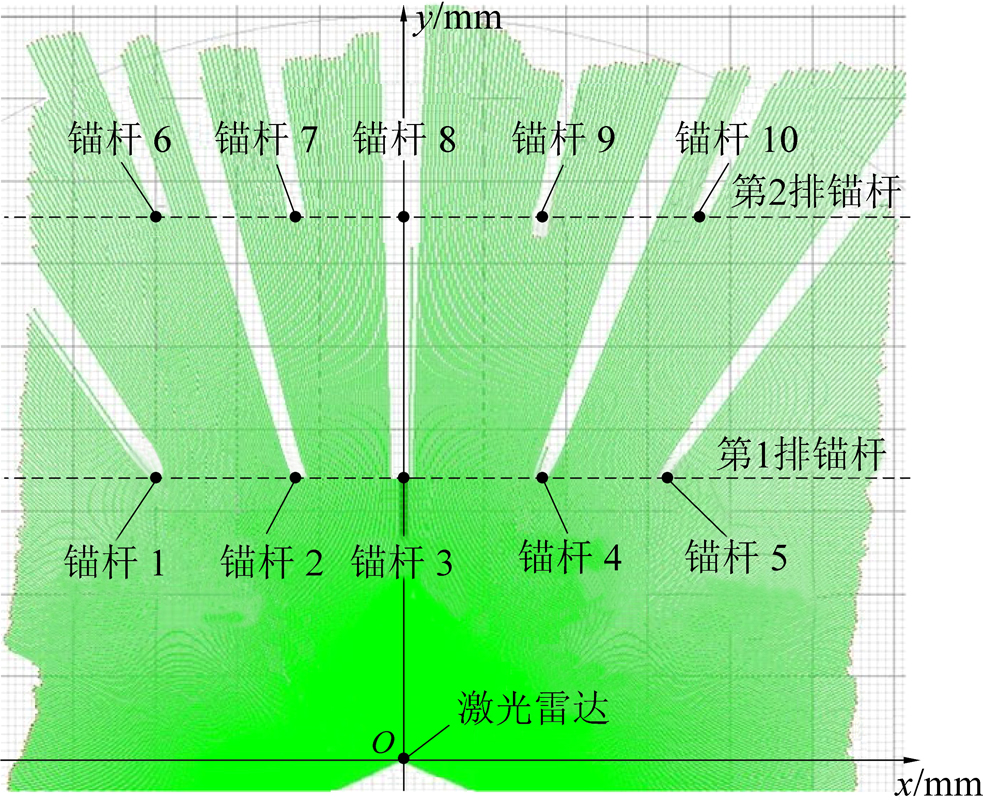 图12 激光扫描锚杆定位效果 在图12中,以激光雷达检测到两排锚杆为例,可得各个锚杆相对于激光雷达的坐标值如下: