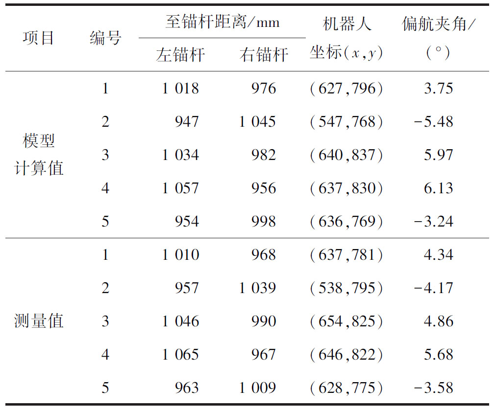 1(-605,798)2(-288,800)3(-0,801)4(310,799)5(607,800)6(-601,1 602)7(-279,1 589)8(-1,1 602)9(305,1 597)10(629,1 601) 第1、2排锚杆在y方向上的差值较大,因此可根据差值确定出y值的阈值选取范围(801~1 589),以消除第2排锚杆对测量结果的影响。 选用第1排锚杆中编号1和编号5的坐标信息解算出激光雷达与锚杆的距离信息和机器人航向与锚杆之间的扫描夹角θ1和θ2,最终根据模型公式可推导出机器人相对于锚杆1的坐标值和偏航夹角的大小,试验结果见表2、如图13所示。