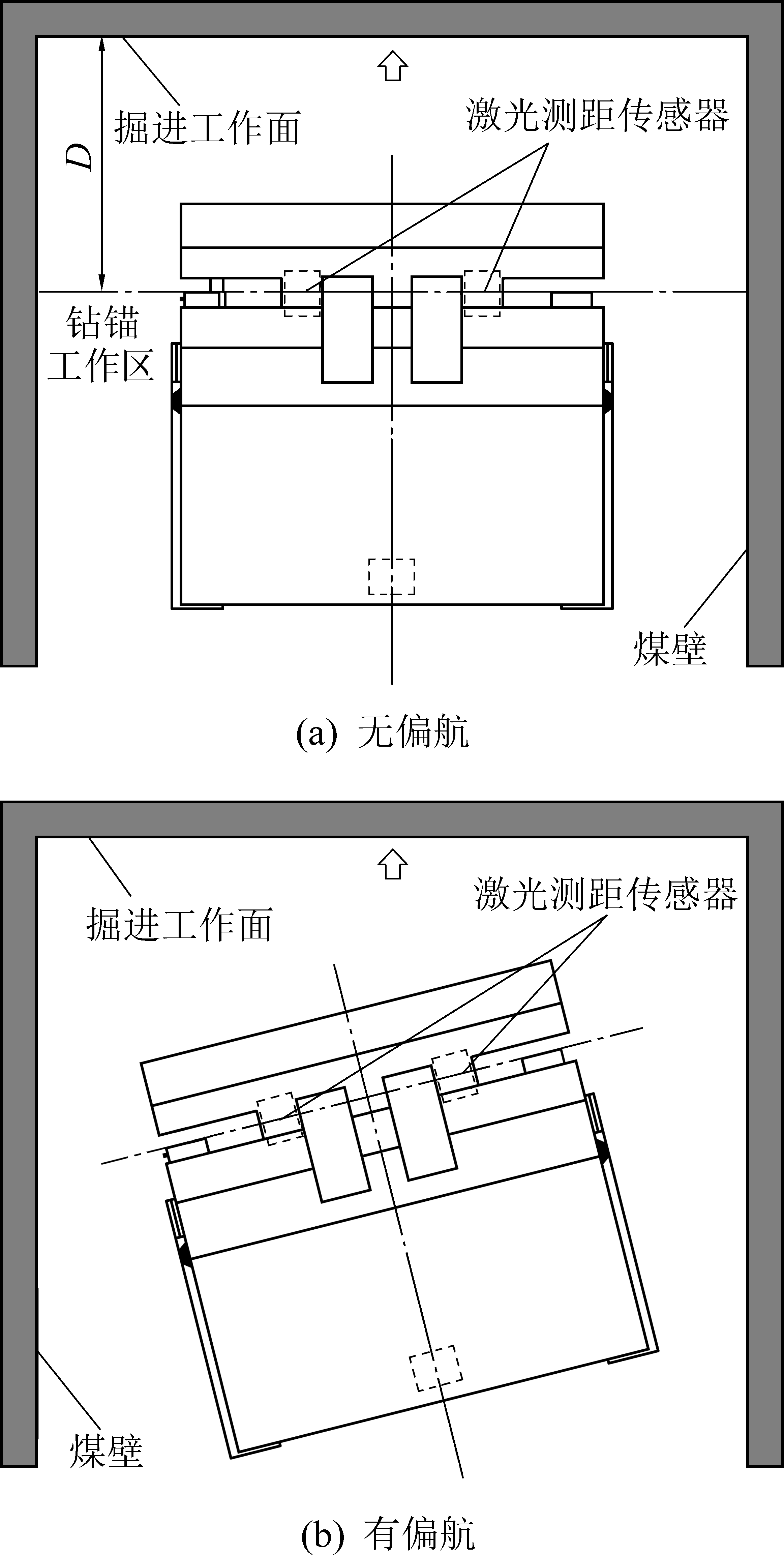 图2 激光测距传感器布放示意 由于掘进工作面存在不平整、欠挖超挖等情况,可通过添加激光测距传感器计算距离平均值等方式来降低定位误差。笔者以左右2个测距传感器为例建立钻锚机器人前移定位模型。 钻锚机器人在前移时的位姿如图3所示,其中D为钻锚工作面与掘进工作面之间的距离,钻锚机器人需要在钻锚工作面上完成掘进机机身以上的钻锚作业。图3a表示机器人向前移动时未发生偏航,图3b表示存在偏航夹角,钻锚工作面没有平行于待钻孔巷道截面,因此需要通过建模分析偏航夹角与所测距离的几何关系,计算得出偏航夹角的大小并确定机器人所在位置,为位姿调整提供重要参数。