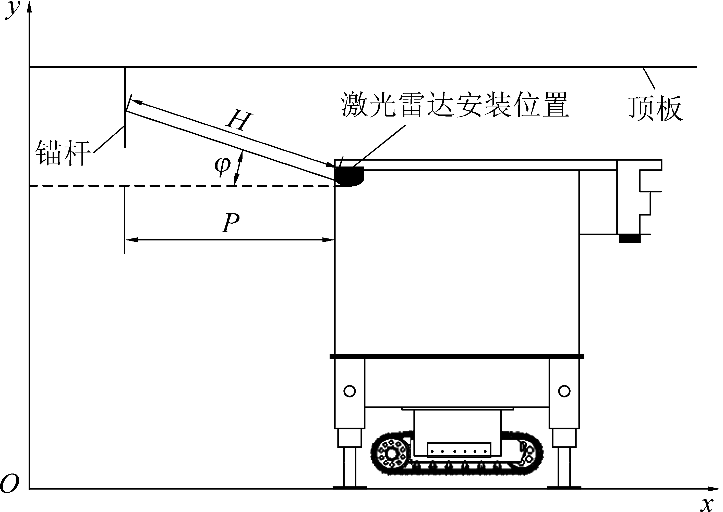 图4 钻锚机器人前移定位模型 可根据β大小,自主或手动调节钻锚机器人位姿,同时观察钻锚机器人与两侧煤壁的距离,当β=0且D1=D2=D时,表明机器人位姿正确,即实现了钻锚机器人前移时的精确定位目标。 2.2 “机器人-锚杆”后移定位模型分析钻锚机器人后移时,采用激光雷达检测钻锚机器人后端与锚杆之间的距离信息,建立基于激光雷达的定位模型并进行分析,实现钻锚机器人后端绝对定位。将激光雷达安装在钻锚机器人后端顶梁结构中间位置,激光雷达可以动态实时成像,还原当时所采集的锚杆图像及距离信息,以便数据提取和模型分析计算。 激光雷达布放如图5所示,为了较好地检测到锚杆位置,采用调整激光雷达安装角度的方式,以便于能够顺利检测到锚杆,最终通过水平投影计算抵消安装角度带来的误差即可,激光雷达测距原理如图6所示。P为钻锚机器人后端与锚杆所在平面之间的水平距离,φ为安装传感器时设置的角度,其大小可根据实际情况设定,结合激光雷达实际检测距离H可得水平投影距离Hsin φ。